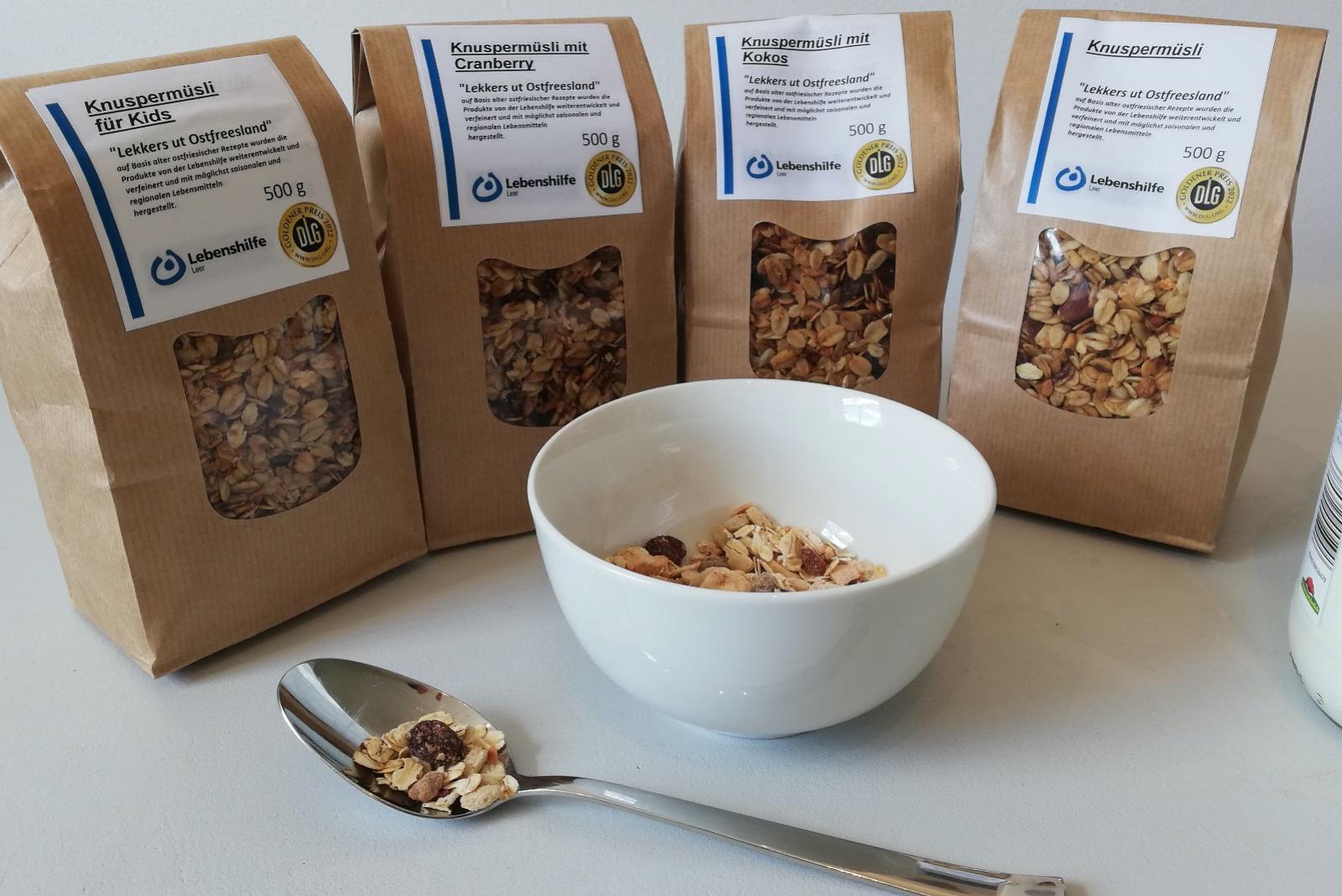 Die Deutsche Landwirtschaftsgesellschaft (DLG) hat vier Müsli-Mischungen der Lebenshilfe Leer mit dem Gold-Prädikat ausgezeichnet. Prämiert wurden das »Knuspermüsli«, das »Knuspermüsli mit Kokos«, das »Knuspermüsli mit Cranberry« und das »Knuspermüsli für Kids« aus ...