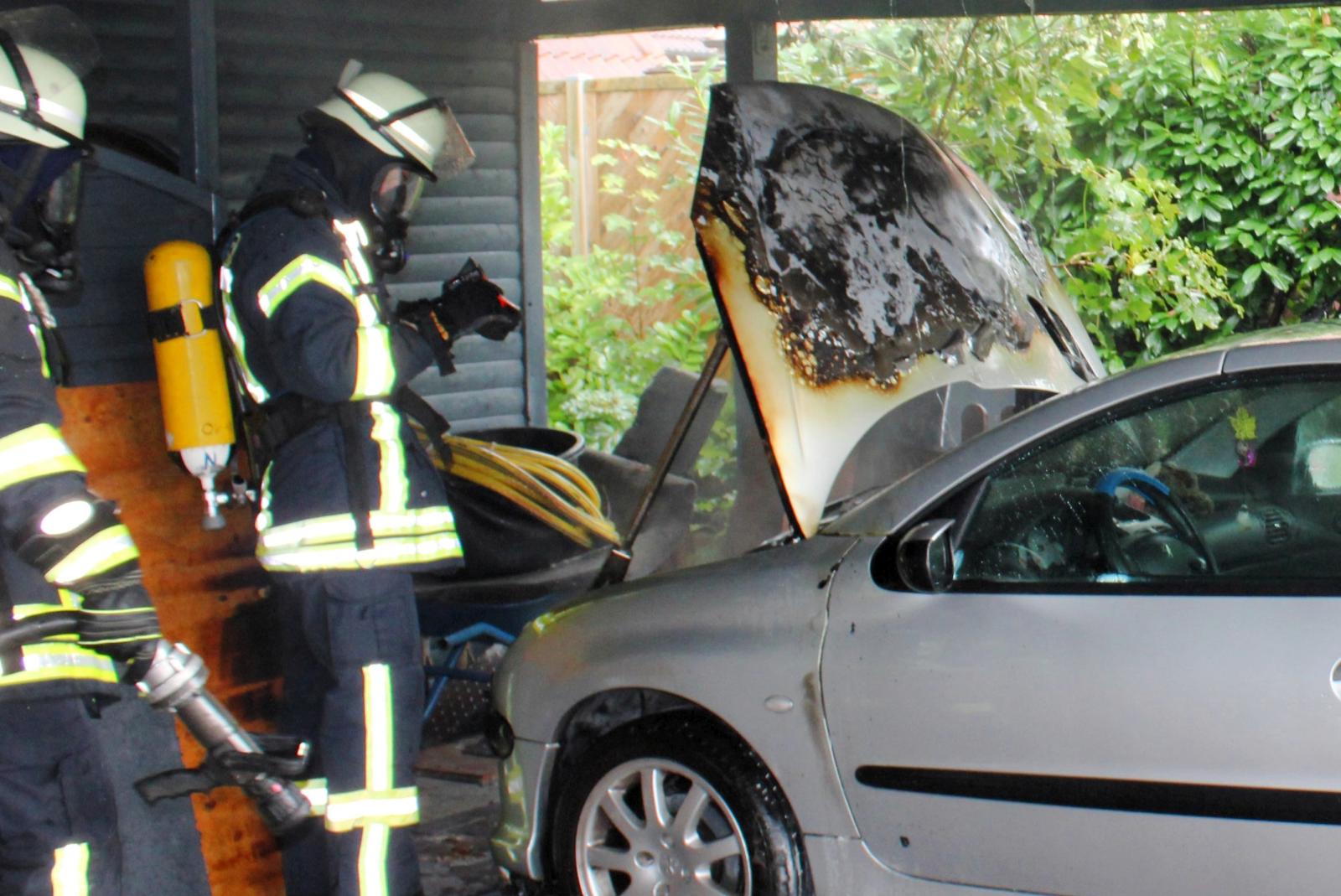 Unter dem Carport brannte es im Motorraum des Peugeot. Laut Polizei ist das Feuer vermutlich im Bereich des Kühlers entstanden. Die Feuerwehr konnte ein Übergreifen der Flammen auf den Carport und nur wenige Meter entfernte Wohnhaus verhindern.
