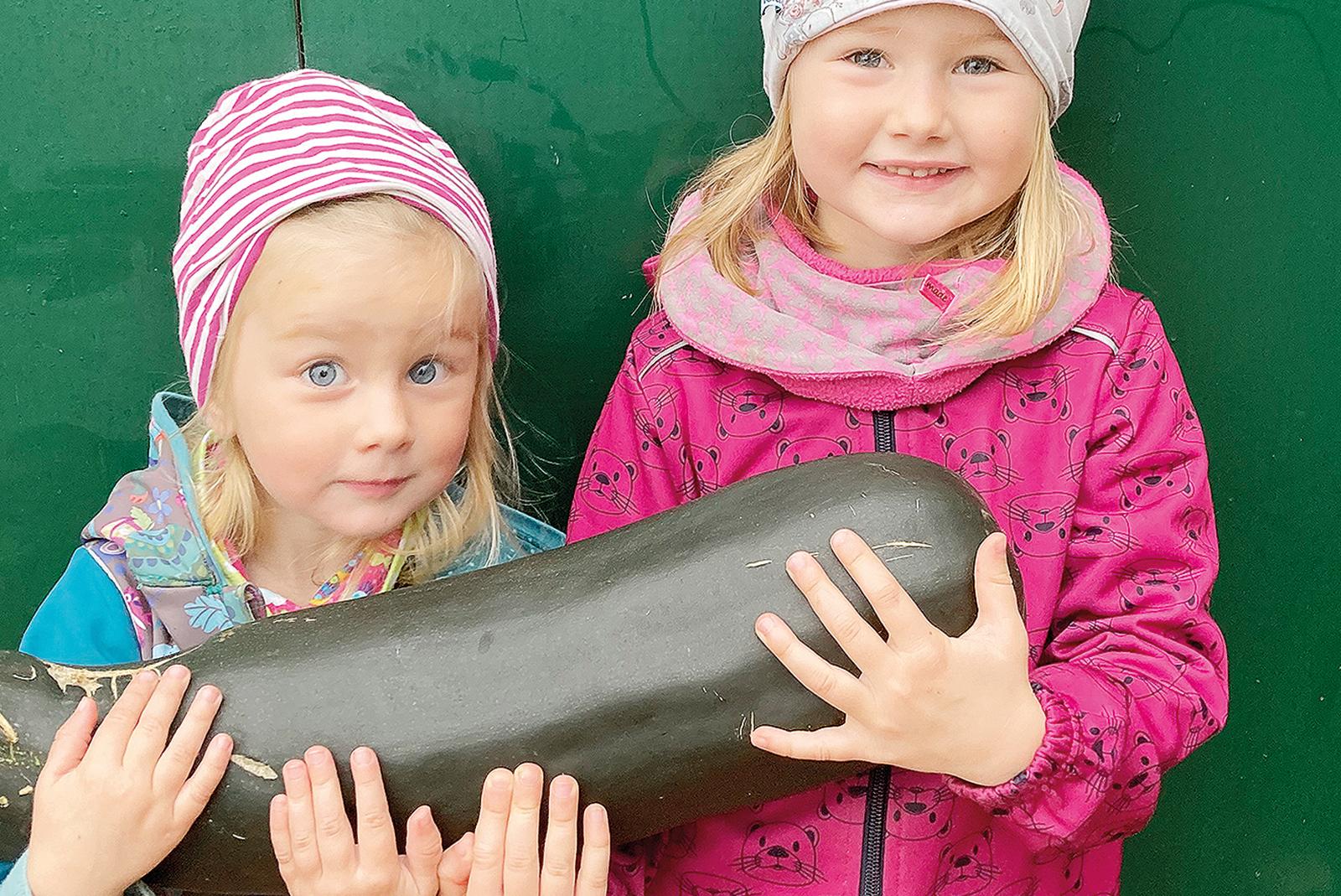 Schwer zu tragen haben Thea und Ida: Sage und schreibe sechs Kilo wog diese letzte Zucchini, die die Beiden zusammen mit ihrer Großmutter Henny Frey aus Möhlenwarf jetzt geerntet haben.