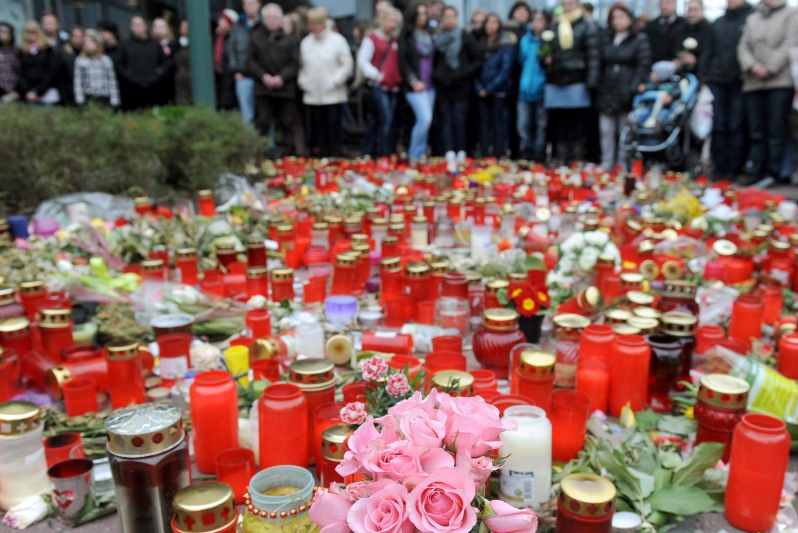 Menschen gedenken vor den Blumen und Kerzen am City-Parkhaus in Emden (Niedersachsen) der ermordeten elfjährigen Lena. Nun steht der Mörder wegen Vergewaltigung einer Frau erneut vor Gericht. © Wagner/dpa