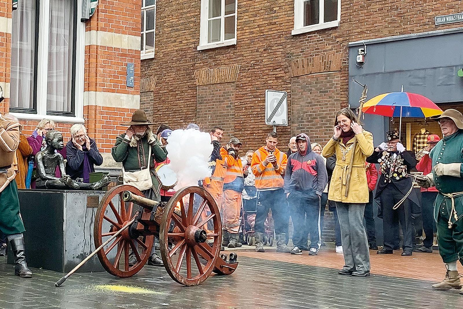 Mit einem ohrenbetäubenden Kanonenschuss eröffnete Oldambts Bürgermeisterin Cora-Yfke Sikkema (auf dem Foto rechts in gelber Jacke) gestern um 10.08 Uhr vor dem Rathaus den historischen Adrillenmarkt in Winschoten. Nach einem Rundgang mit den Gästen, darunter auch Bü...