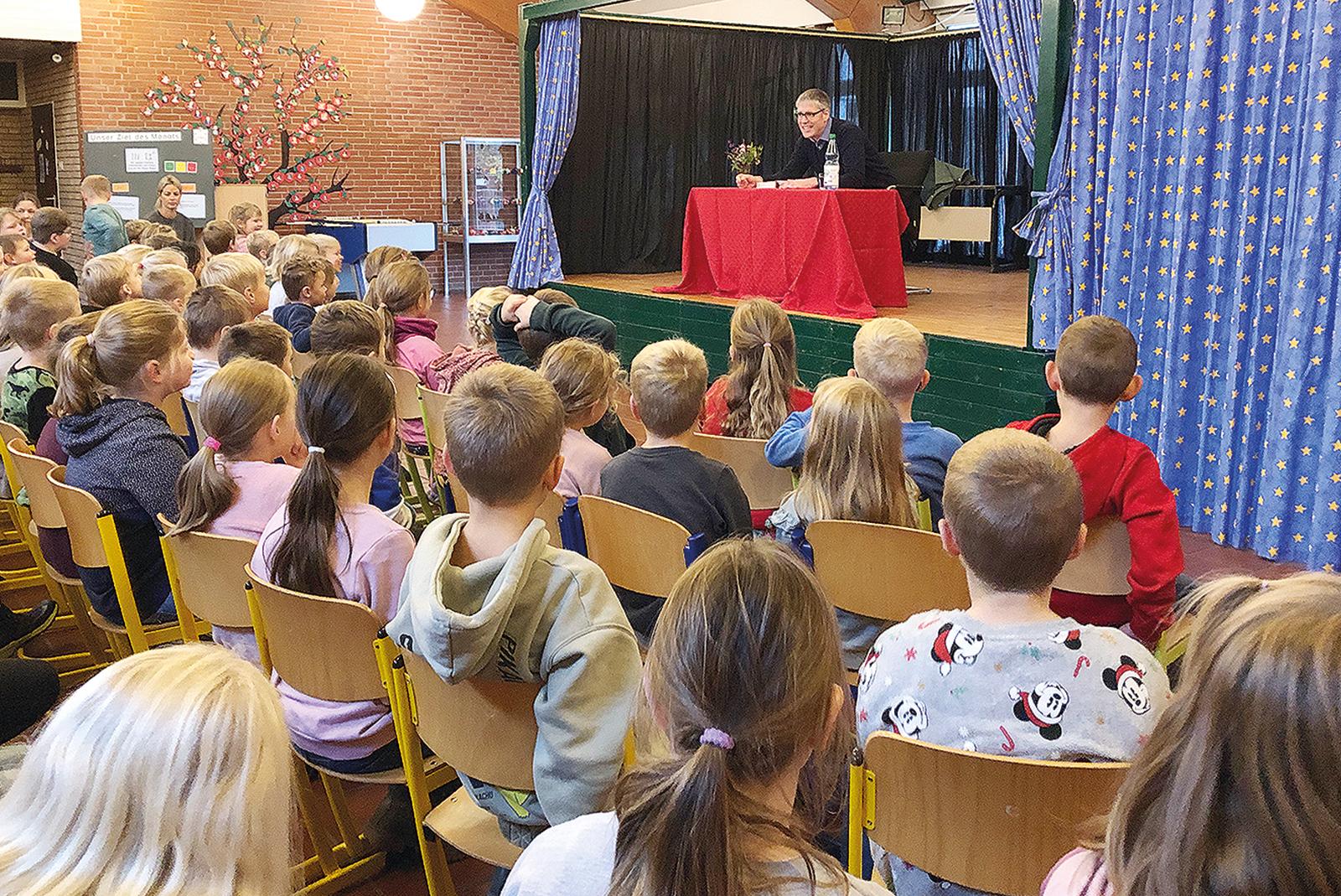 Großer Bahnhof am Freitagvormittag in der Aula der Grundschule Holthusen: Auf der Bühne war eigens ein kleiner Tisch aufgebaut und alle Schüler der Klassen 1 bis 4 hatten sich eingefunden, um ihren Gast zu begrüßen – Bürgermeister Heiko ...