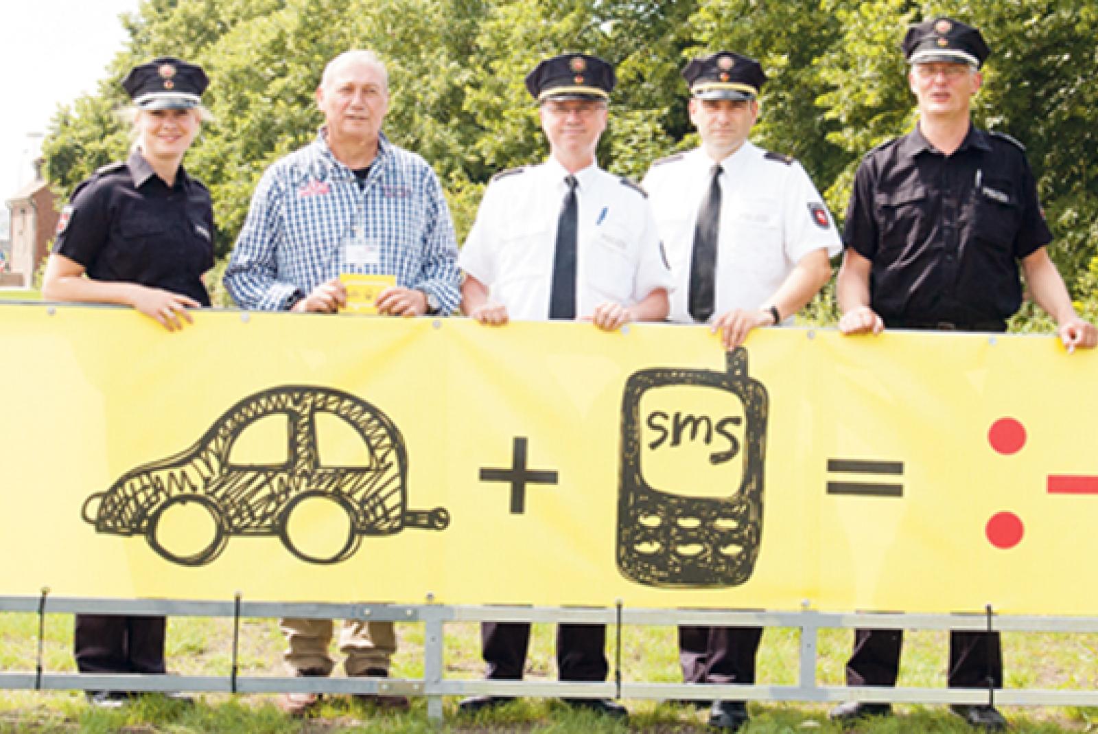 Autofahren und auf dem Handy tippen macht am Ende niemanden glücklich. Die Polizei stellte am Montag ihre neue Präventionskampagne gegen die Handynutzung während der Fahrt vor. Von links: Anna Maria Pötter (Polizeitraining), Reiner Priet (Verkehrswacht Landkreis Leer), Johannes Lind (Polizeidirektor Leer/Emden), Robert Raaz (Einsatzleitung) und Gerrit Hinrichs (Verkehrssicherheitsberater). © Foto: de Winter
