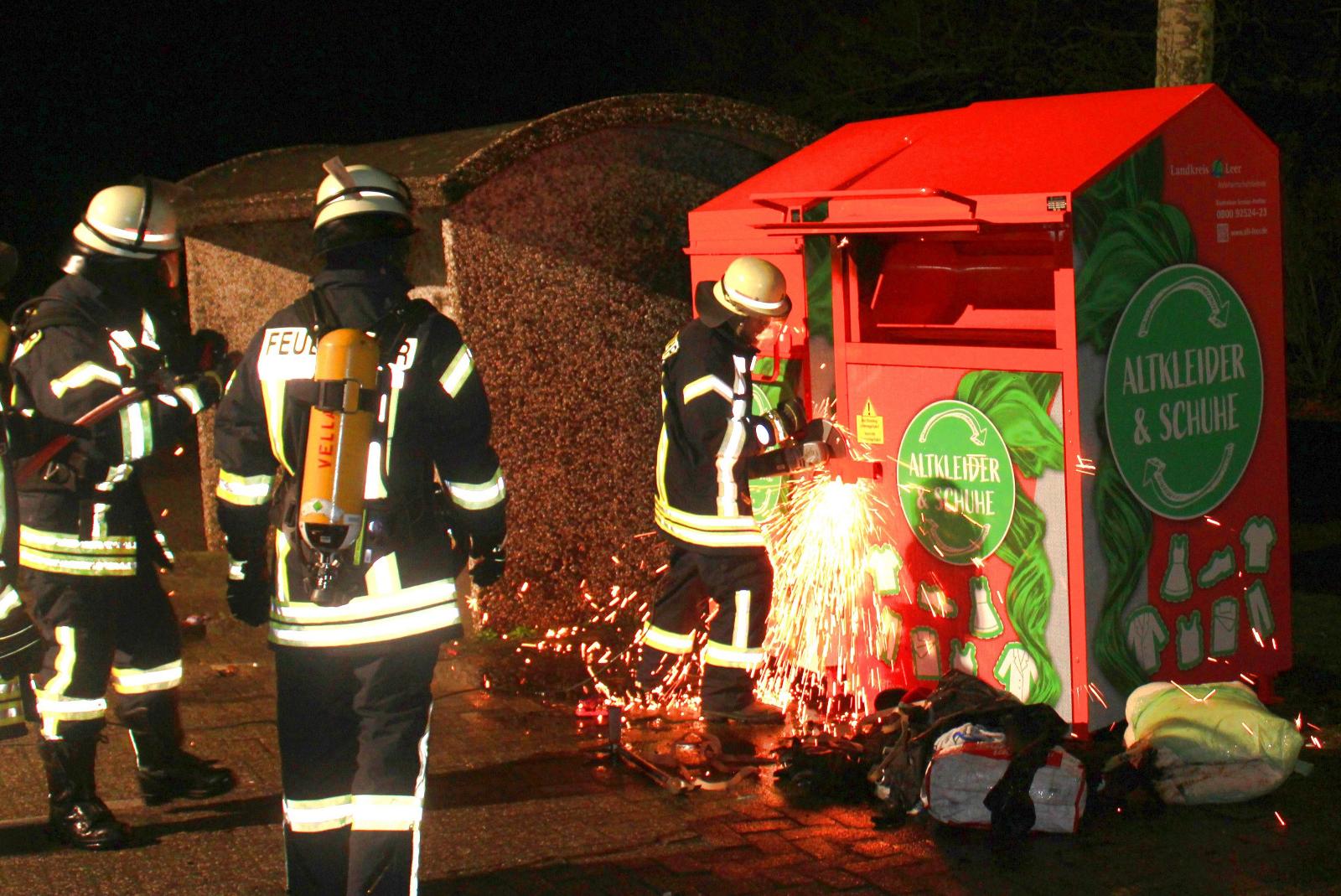 Die Feuerwehren aus Holthusen und Weener wurden am Samstag um 18.14 Uhr zu einem Brandeinsatz alarmiert. An der Mittelstraße in Holthusen auf dem Parkplatz gegenüber der Grundschule brannte ein Altkleidercontainer, teilte die Feuerwehr mit. Ein Passant hatte das Feuer gesehen und umgehend den Notruf gewählt.