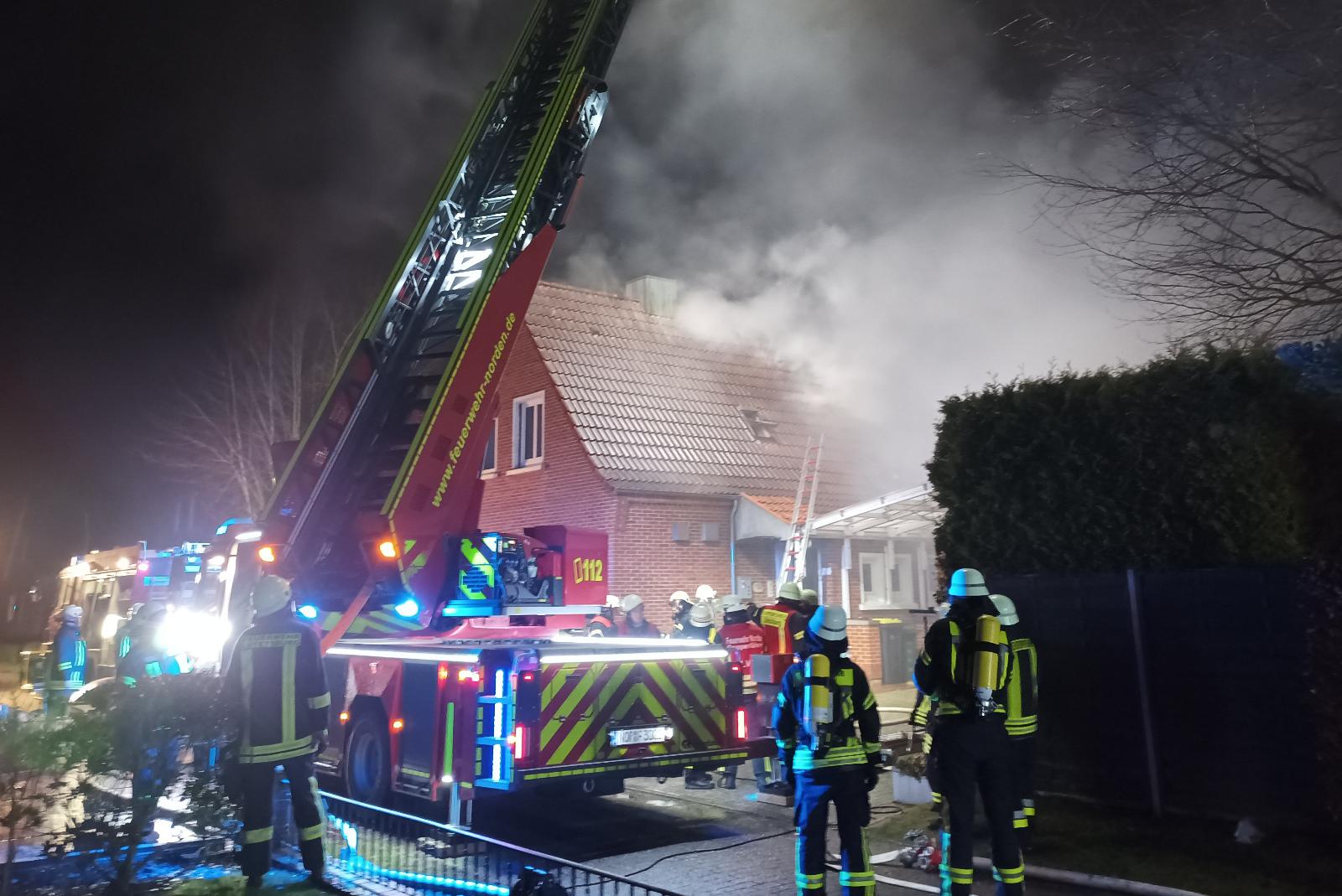 Nach einem Brand am Donnerstagabend ist ein Einfamilienhaus in Hage (Kreis Aurich) vorerst nicht mehr bewohnbar. Kurz bevor sie zu Bett gehen wollten, waren die beiden Bewohner, ein 69-jähriger Mann und eine 70-jährige Frau, durch die Rauchentwicklung aufgeschreckt worden. Sie retteten sich ins Freie und mussten vom Rettungsdienst betreut werden. Der Mann kam vorsorglich ins Krankenhaus. Ein Großaufgebot von rund 110 Einsatzkräften mehrerer Feuerwehren bekämpfte den Brand, bei dem nach Schätzungen der Polizei ein Sachschaden im sechsstelligen Euro-Bereich entstanden ist.