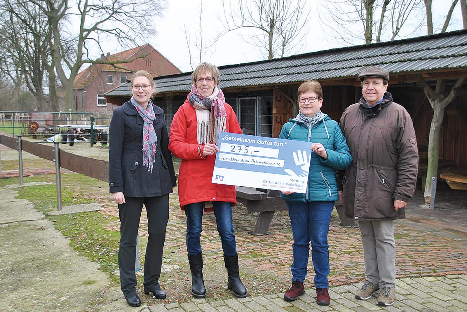 Die Stiftung Ostfriesische Volksbank unterstützt den Heimatkundlichen Arbeitskreis bei der Restaurierung eines alten Ackerwagens, der gegen Ende des 18. Jahrhunderts gebaut wurde, mit einem Betrag von 275 Euro. Andrea Wilken (links) als Vertreterin der Stiftung übergab den symbolischen Scheck jetzt auf ...