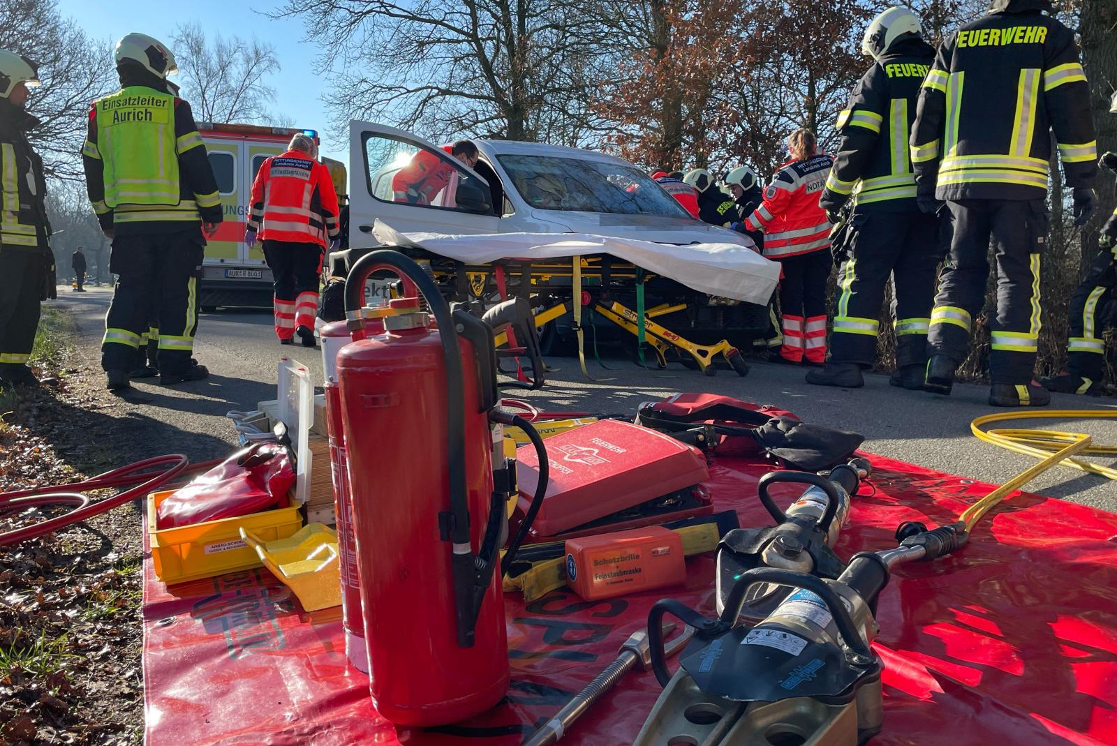 Bei einem Verkehrsunfall in Schirum bei Aurich ist am Dienstagmorgen ein Autofahrer schwer verletzt worden. Er musste aus dem Wrack seines Fahrzeugs von der Feuerwehr befreit werden.