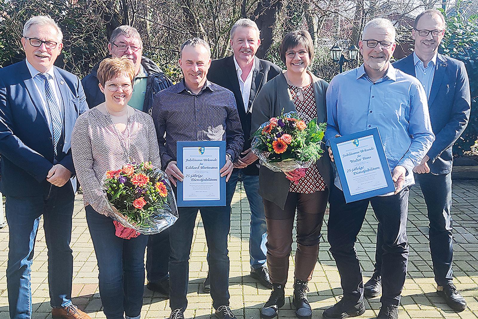 Anlässlich ihrer 25-jährigen Dienstjubiläen beim Wasserversorgungsverband Rheiderland (WVV) wurden jetzt die beiden Rohrnetzmitarbeiter Eckhard Hartmann (Zweiter von links hinten) und Walter Buss (vorne rechts) vom Verbandsvorsitzenden Helmut Geuken (links) und dem Verbandsgeschäftsführer Jan Schulte (Mitte) ...