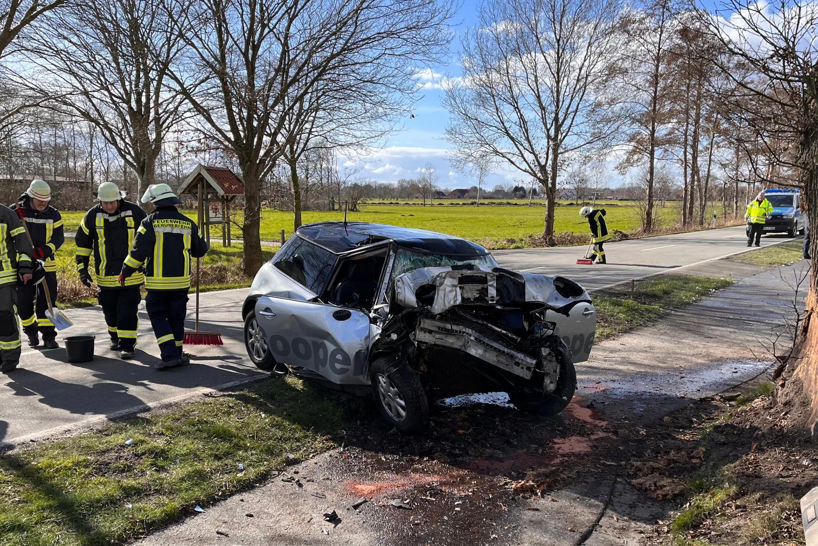 Ein 19-Jähriger wurde am Samstagmittag bei einem Verkehrsunfall in Berumerfehn (Landkreis Aurich) in seinem Auto eingeklemmt und schwer verletzt. Wie die Auricher Kreisfeuerwehr mitteilt, musste der junge Mann reanimiert und mit dem Rettungshubschrauber ins Krankenhaus gebracht werden.