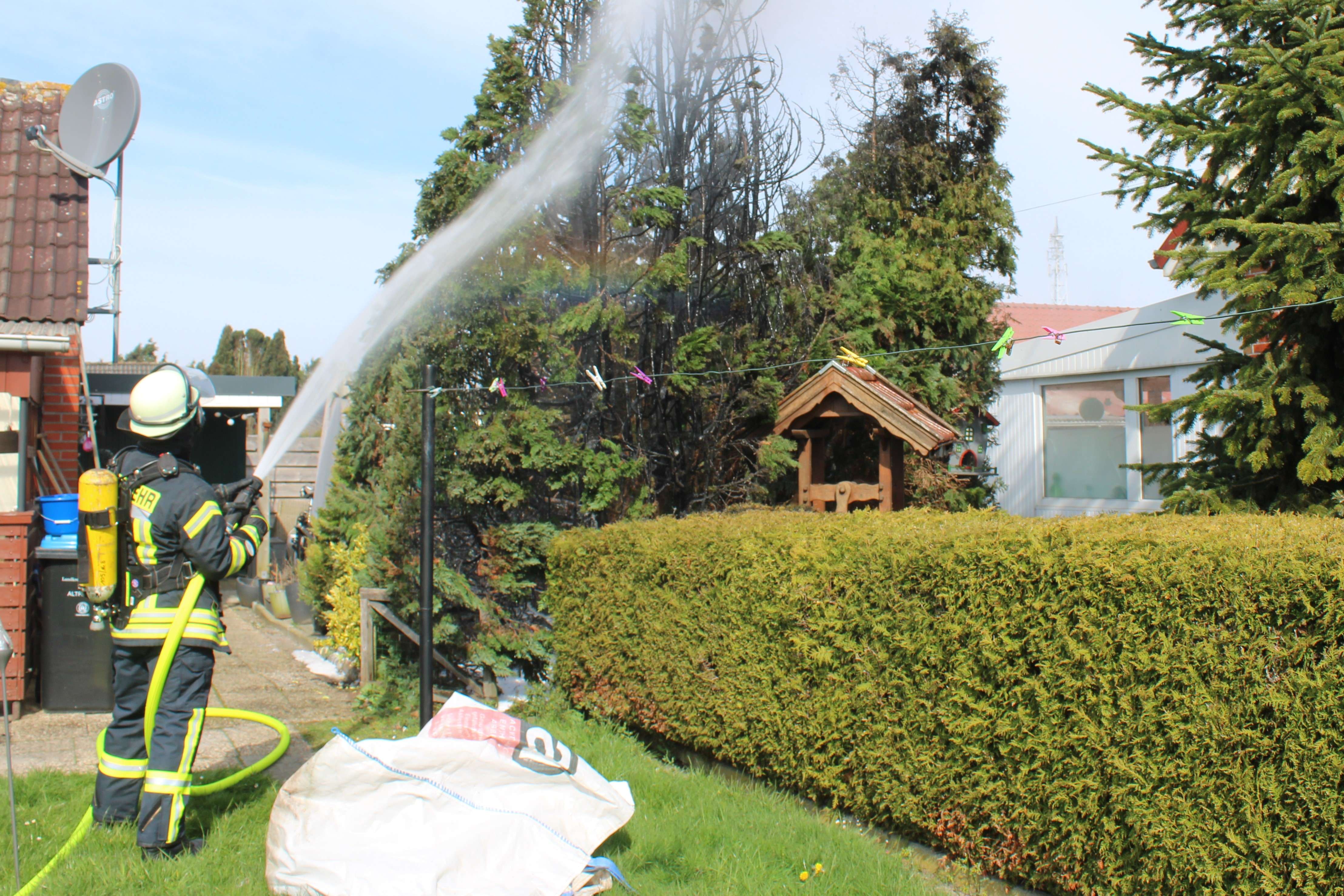 Als die Feuerwehr vor Ort eintraf, hatten Anlieger den brennenden Busch allerdings schon weitestgehend selbst mit einem Gartenschlauch gelöscht. Nach dem Ablöschen der letzten Glutnester mit dem Schnellangriff und Wasser aus dem Tank des Löschgruppenfahrzeugs konnte die Feuerwehr wieder abrücken.
