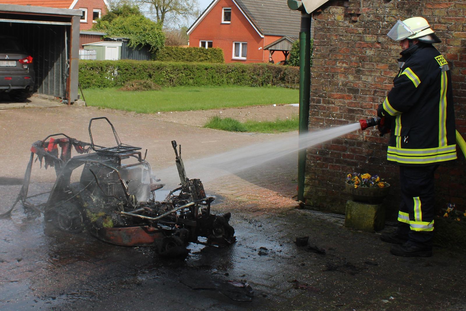 Ein brennender Rasenmähertrecker, der direkt an einem Hofgebäude an der Hauptstraße in Stapelmoor stand, rief heute um 15.55 Uhr gleich vier Feuerwehren auf den Plan.
