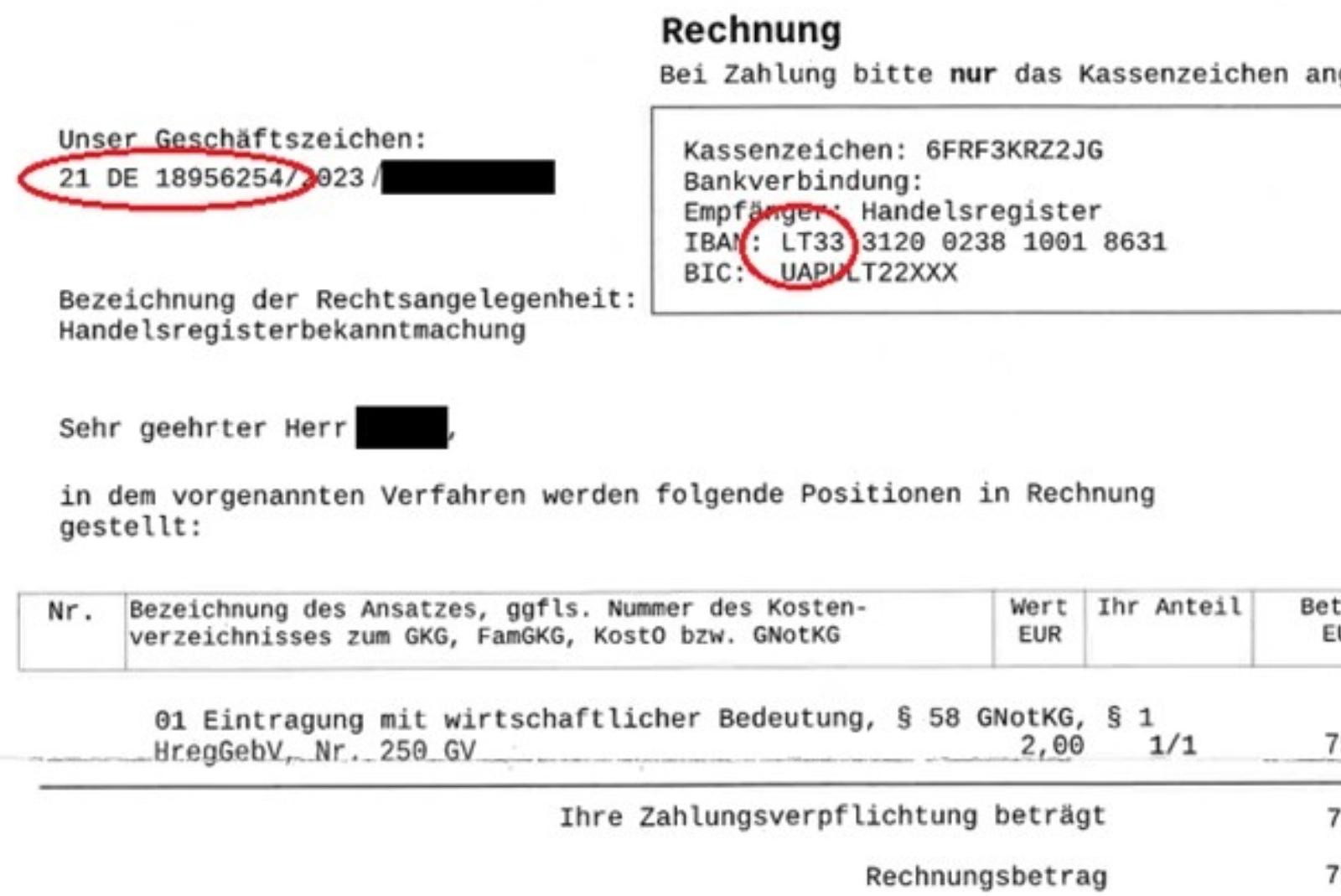Getarnt unter Absendern wie "Handelsregistereintragung" oder "Zentrale Zahlstelle Justiz" fordern die Täter Rechnungsbeträge von mehreren Hundert Euro ein, so die Polizei. Die Schreiben wirken offiziell, sind etwa mit einem Wappen versehen und nennen die korrekten Daten des Empfängers wie die zugehörige Handelsregisternummer, das Veröffentlichungsdatum und das zuständige Amtsgericht. Es wird auf eine zügige Zahlung hingewiesen. Wer genauer hinsieht, erkennt aber möglicherweise auch unstimmige Angaben zum Absender (wie ein falsches Wappen oder unterschiedliche Ortsangaben) oder eine verdächtige IBAN, die zu einem Bankkonto im Ausland führt.