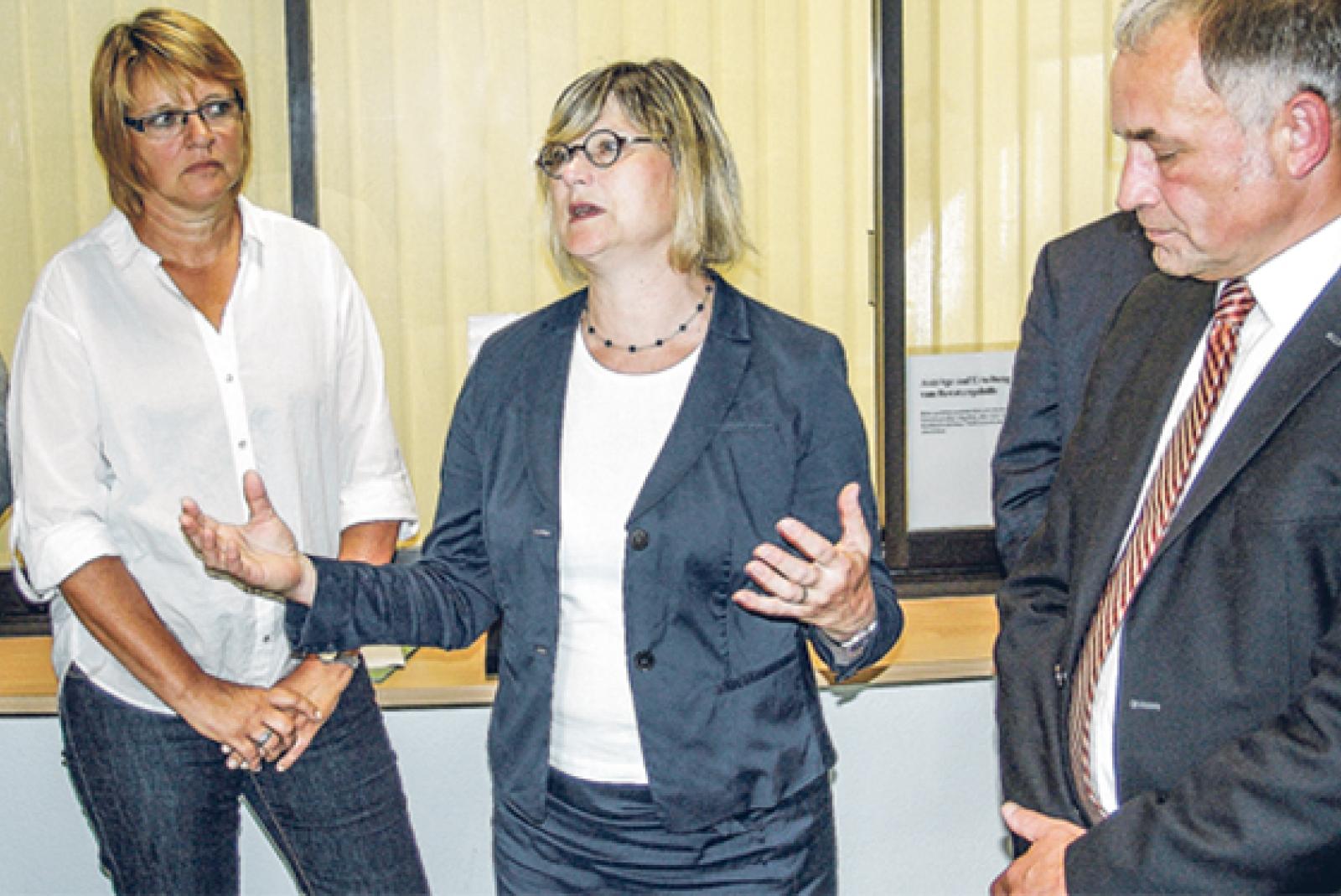 Justizministerin Antje Niewisch-Lennartz (Mitte) sprach mit Amtsdirektor Norbert Bruns (rechts) über die Probleme am Amtsgericht in Leer. Auch die Landtagsabgeordnete Meta Janssen-Kucz (Grüne) nahm an dem Gespräch gestern Vormittag teil. © Foto: Boelmann