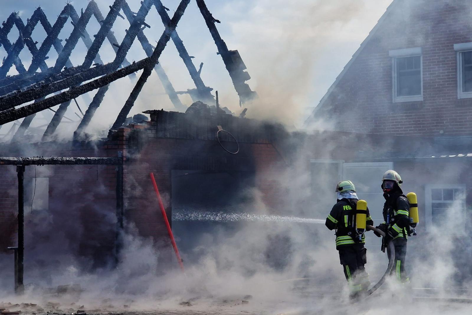 Lichterloh in Flammen stand am Sonnabend eine Garage in Großheide (Kreis Aurich). Insgesamt 70 Einsatzkräfte der Feuerwehr mit neun Löschfahrzeugen bekämpften den Brand. Sie konnten das angrenzende Wohnhaus schützen, das nur minimal beschädigt wurde. Die Garage wurde jedoch komplett zerstört. Ein Sprinter, der direkt vor der Garage parkte, wurde von Angehörigen auf die Straße gefahren. Dort konnte das Heck, das durch das Feuer erheblich beschädigt wurde, nochmals gelöscht werden .Nach ersten Schätzungen der Polizei beläuft sich der Gesamtschaden auf circa 30.000 Euro. Die Brandursache ist bislang nicht bekannt.