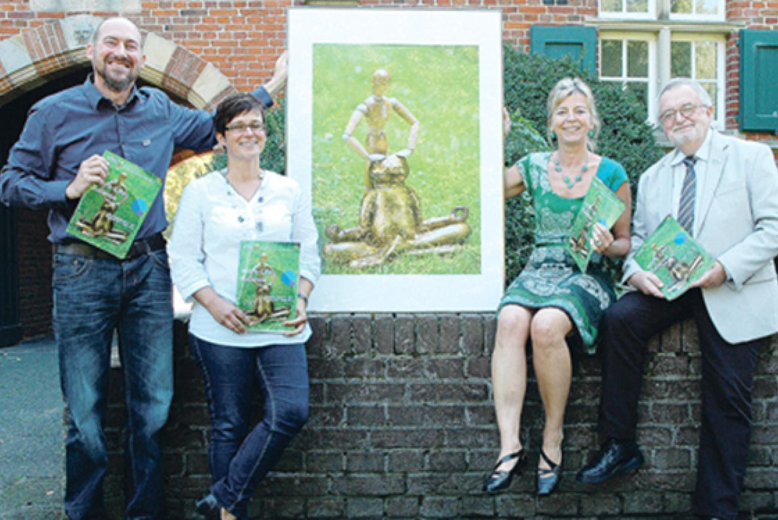 Das eingerahmte Titelbild des neuen VHS-Programmhefts umrahmen der Marketing-Beauftragte Sebastian Schatz, Fachbereichsleiterin Sabine Kasimir, Leiterin Heike-Maria Pilk und der Vereinsvorsitzende Jörg Furch (von links). © Foto: Szyska