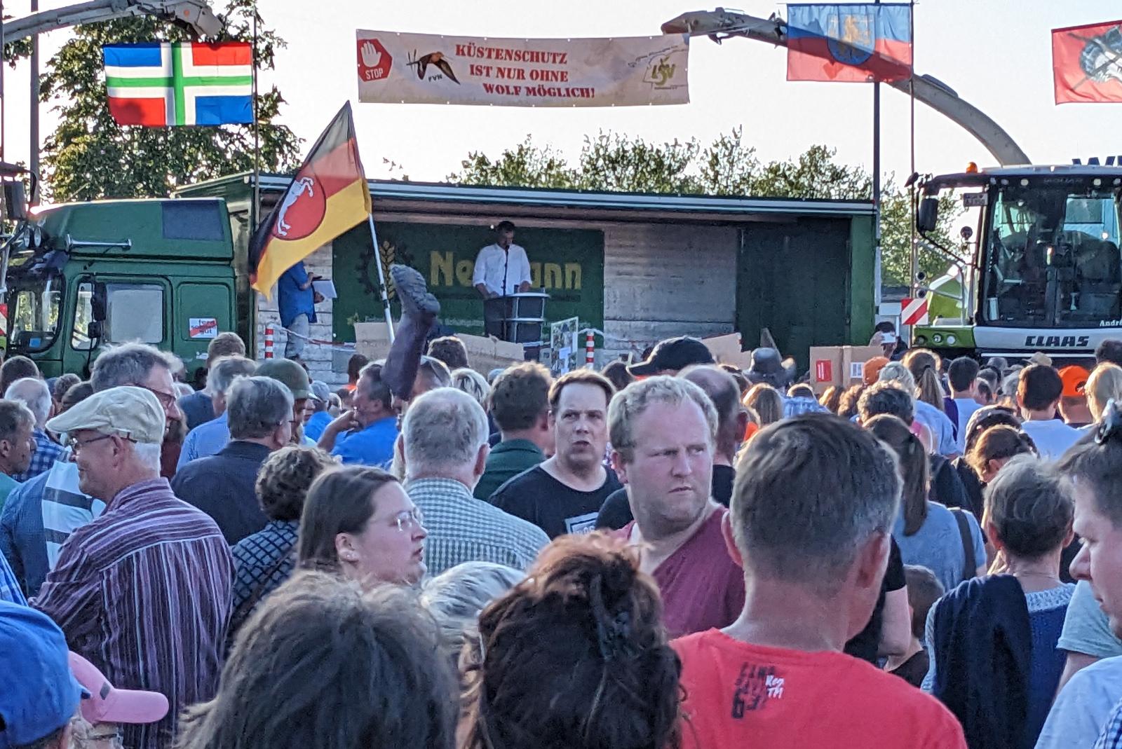 Rund 3000 Menschen versammelten sich nach Schätzungen der Polizei am frühen Samstagabend auf dem Parkplatz der Auricher Sparkassenarena zu einer Anti-Wolf-Demo. Zuvor hatten sich etwa gegen 17 Uhr auf der gegenüberliegenden Seite auf dem Bü...