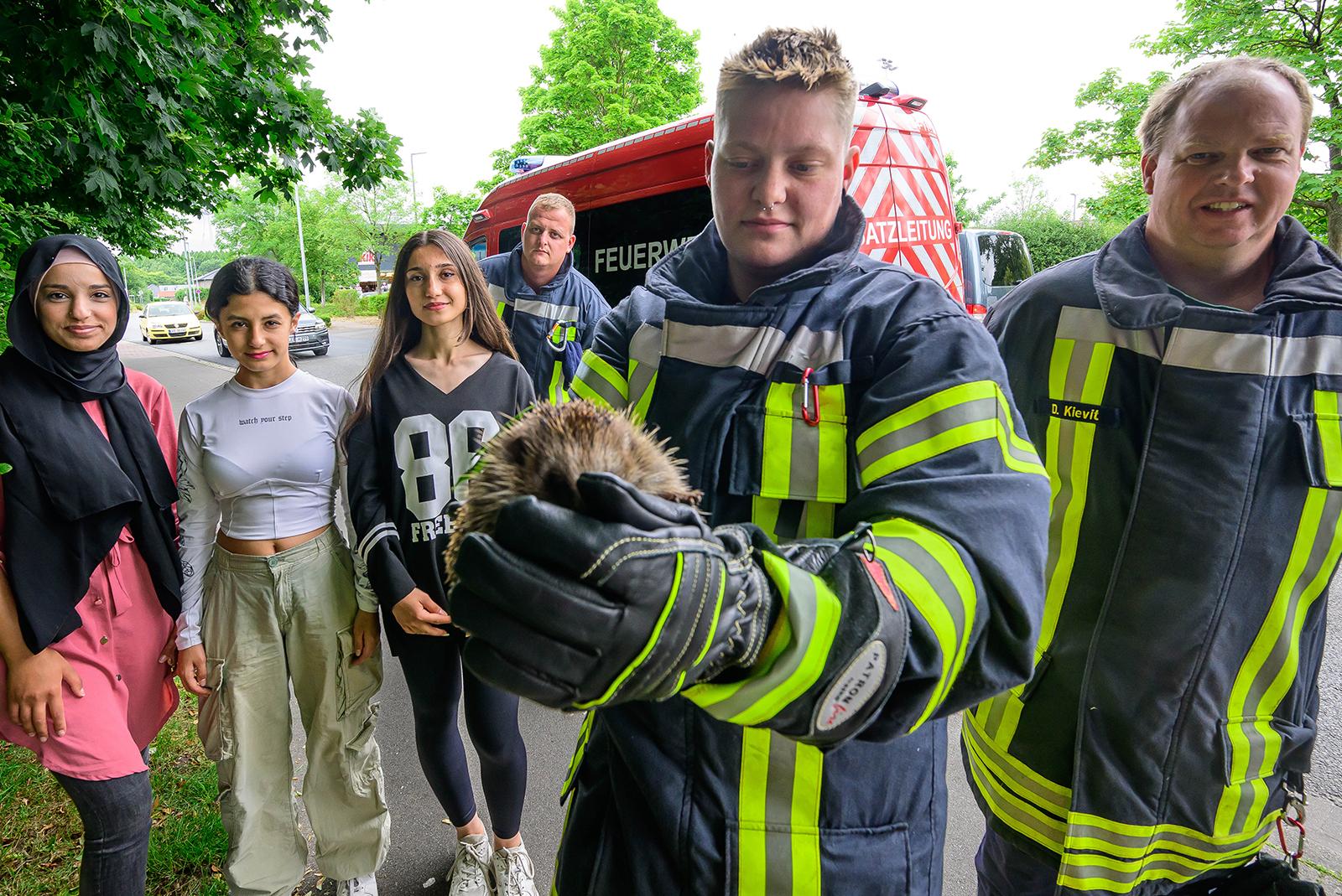 Zu einem Einsatz mit dem Stichwort »Tier in Not« rückten heute Mittag um 12.12 Uhr fünf Einsatzkräfte der Freiwilligen Feuerwehr Weener aus: Ein Igel hing in einem Maschendrahtzaun an der Neuen Feldstraße fest. Diese drei jungen Mä...