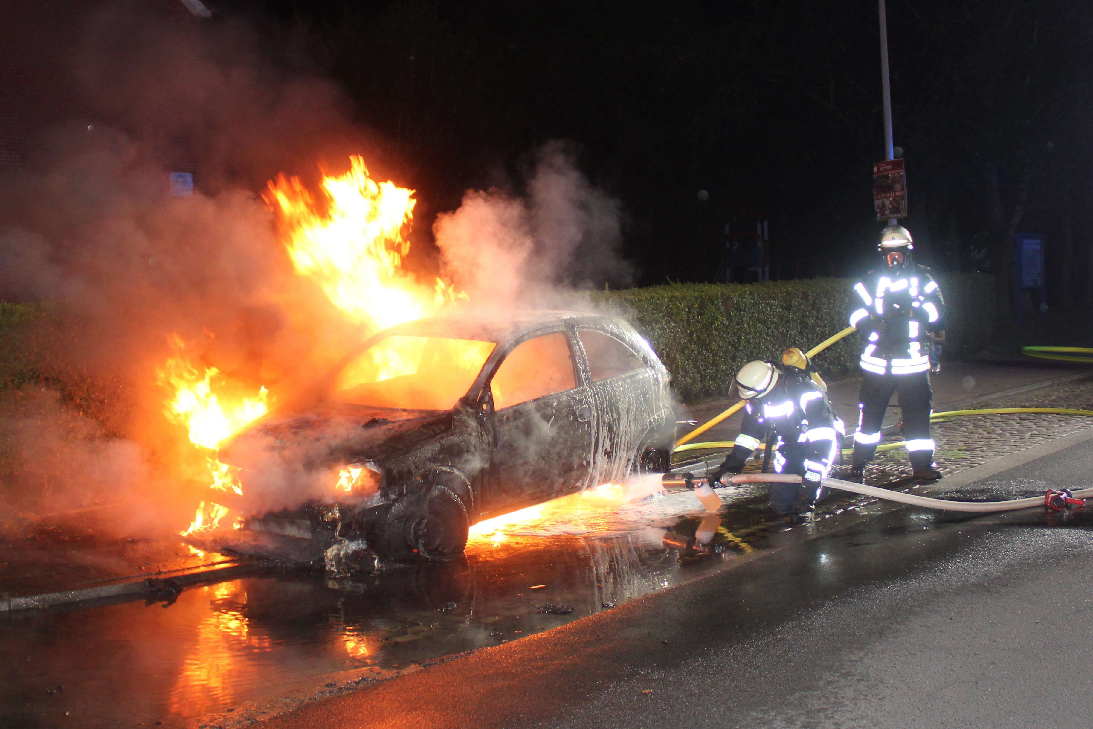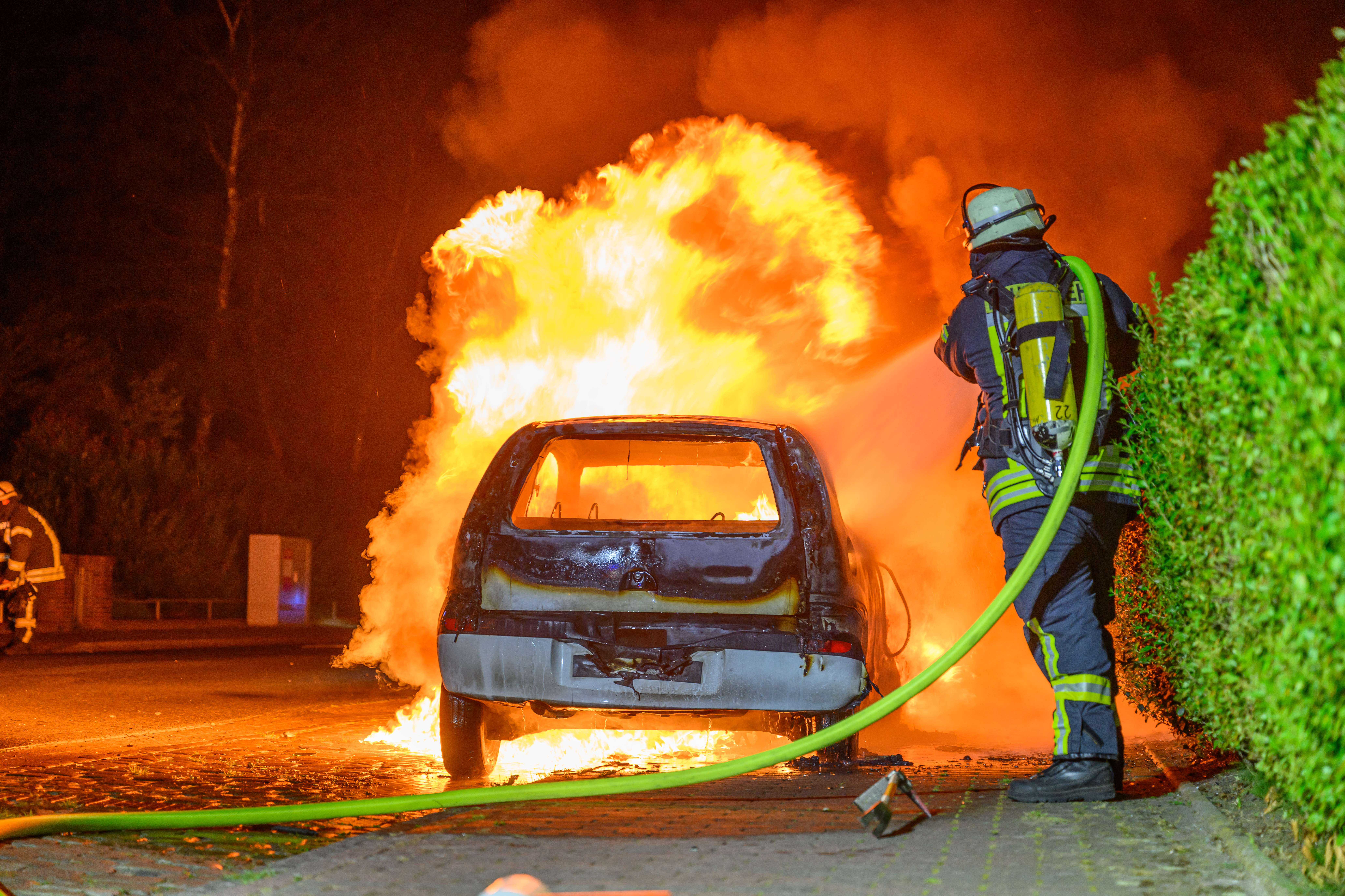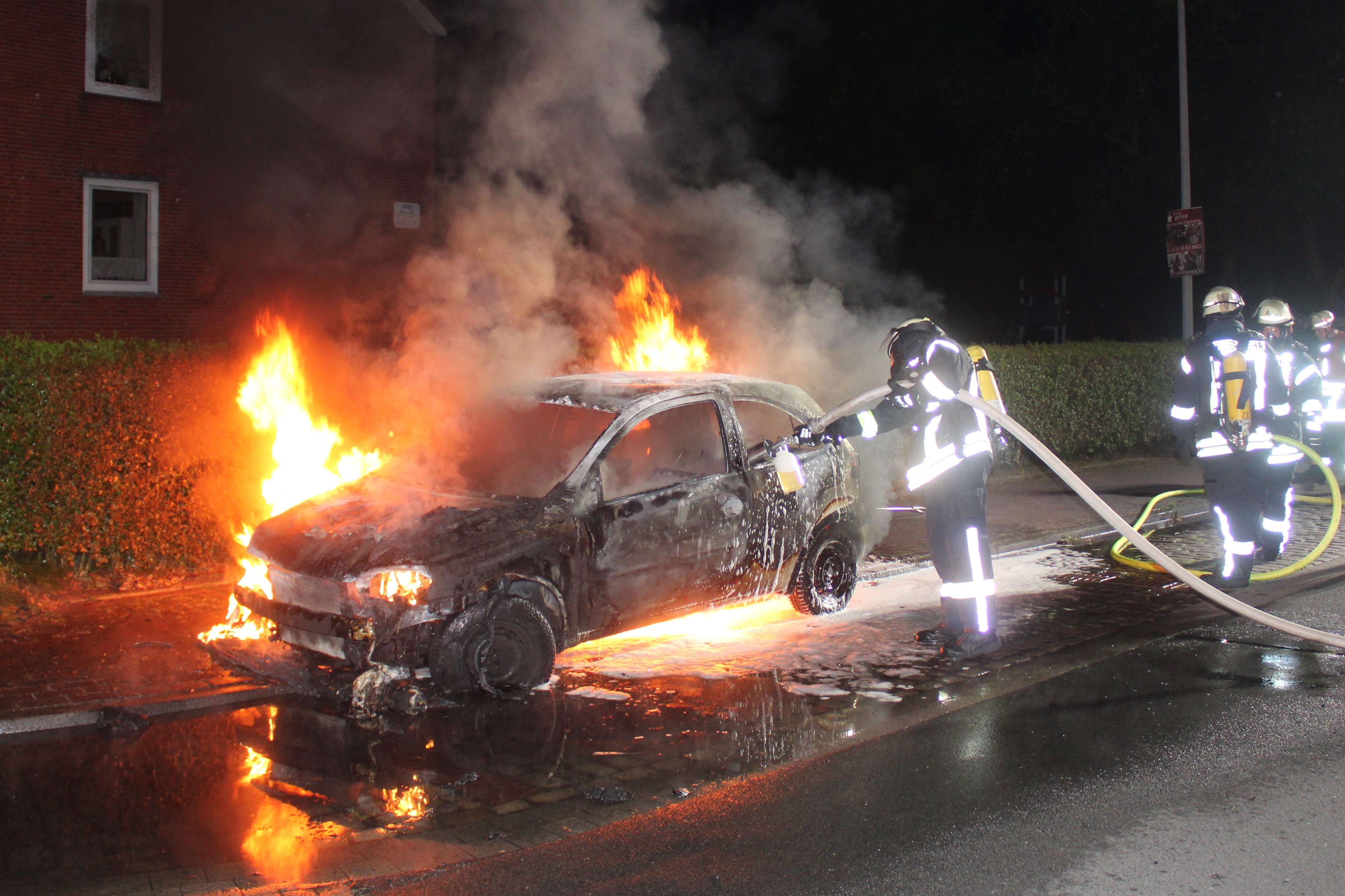 In der Norderstraße in Weener ist in der Nacht zu Donnerstag aus noch ungeklärter Ursache ein Auto in Brand geraten. Die Feuerwehr Weener wurde um 0.38 Uhr alarmiert. Als die Einsatzkräfte am Ort des Geschehens im Bereich der Nordrandsiedlung eintrafen, stand der weiße Opel Corsa bereits lichterloh in Flammen.