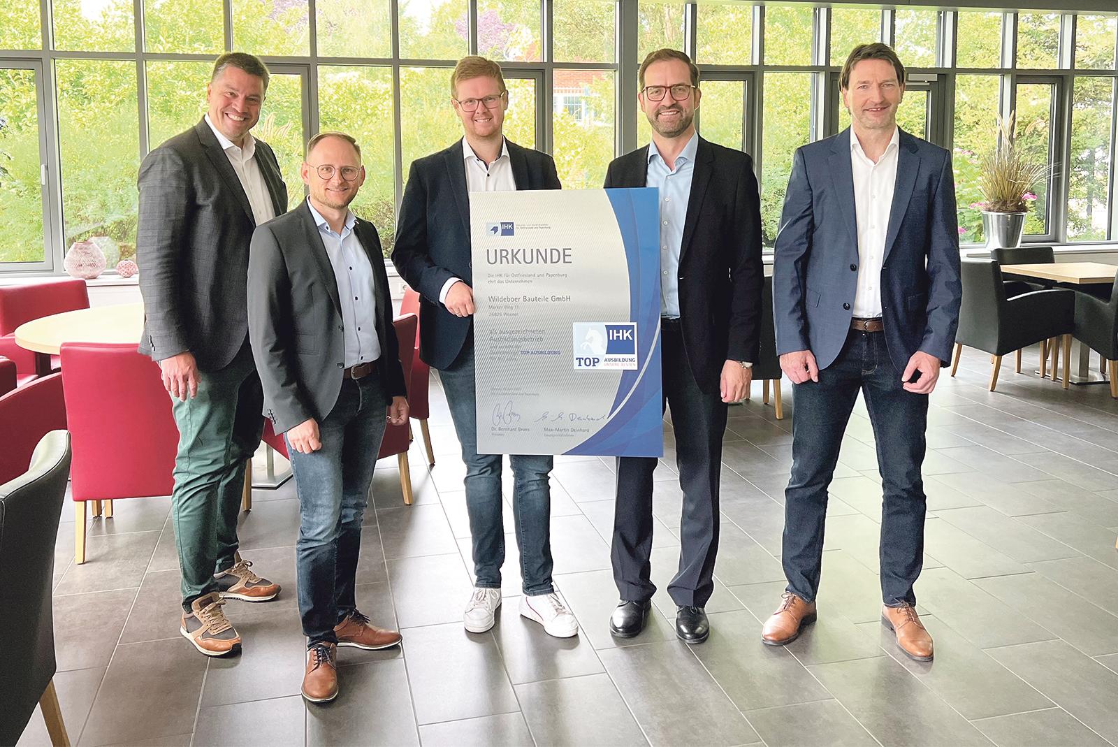 Die Industrie- und Handelskammer (IHK) für Ostfriesland und Papenburg hat die Wildeboer Bauteile GmbH mit dem landesweiten Gütesiegel »TOP Ausbildung« ausgezeichnet. Das Unternehmen bildet im kaufmännischen Bereich Industriekaufleute und Fachkräfte für Lagerlogistik aus.