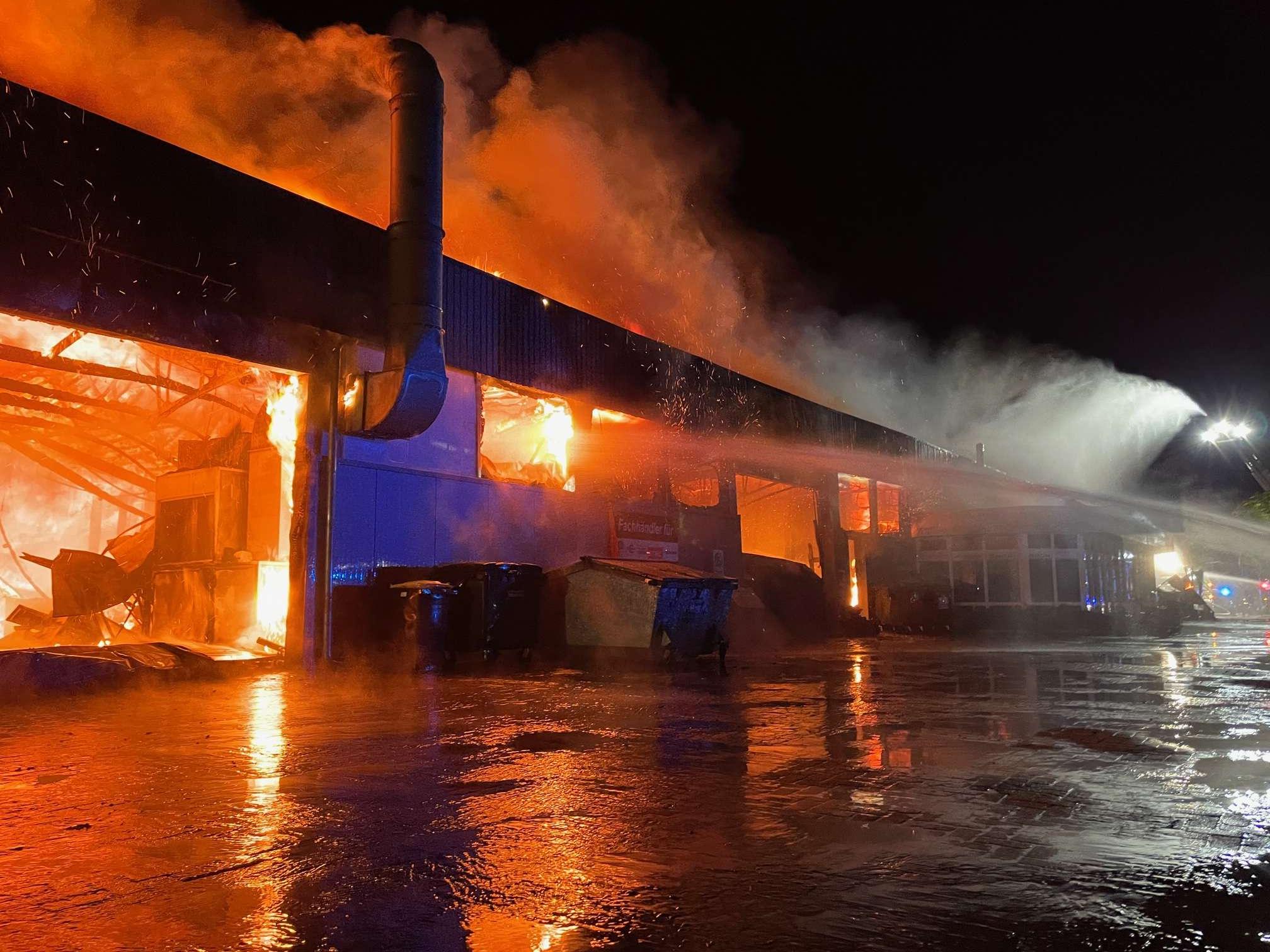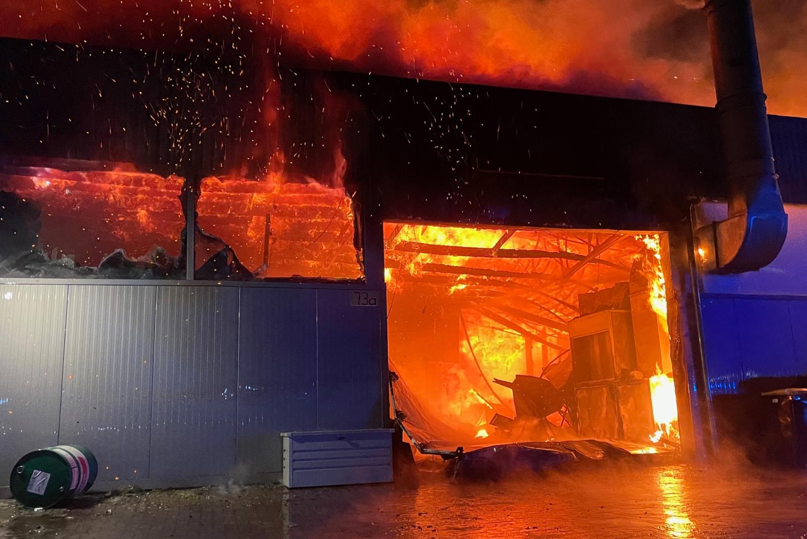 Das Feuer breitete sich nach ersten Löschversuchen weiter aus, in der Halle lagerten unter anderem zahlreiche Gasflaschen, die in kurzer Zeit explodierten. Außerdem befanden sich in der Halle unter anderem drei Reisebusse und ein Boot. Die Feuerwehr konnte ein Übergreifen der Flammen auf zwei benachbarte Wohnhäuser verhindern, die Halle fiel jedoch den Flammen komplett zum Opfer. Bei den Löscharbeiten kamen auch zwei Drehleitern zum Einsatz.