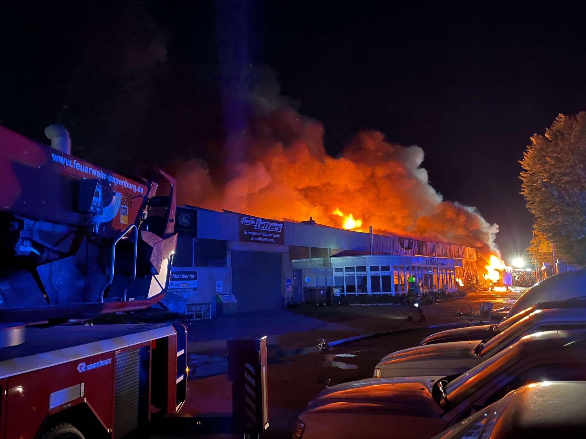 In der Halle befinden sich die Geschäftsräume eines Landmaschinenhändlers, eines Reiseunternehmens sowie eines Fahrzeuglackierers. Beim Eintreffen der ersten Einsatzkräfte der Ortsfeuerwehr Aschendorf stand die Halle bereits in Vollbrand, umgehend wurden weitere Kräfte der Ortsfeuerwehren Obenende und Untenende alarmiert. Zusätzliche Unterstützung kam von den benachbarten Ortsfeuerwehren aus Dörpen (Samtgemeinde Dörpen) und Surwold (Samtgemeinde Nordhümmling) sowie aus Rhede (Einheitsgemeinde Rhede).