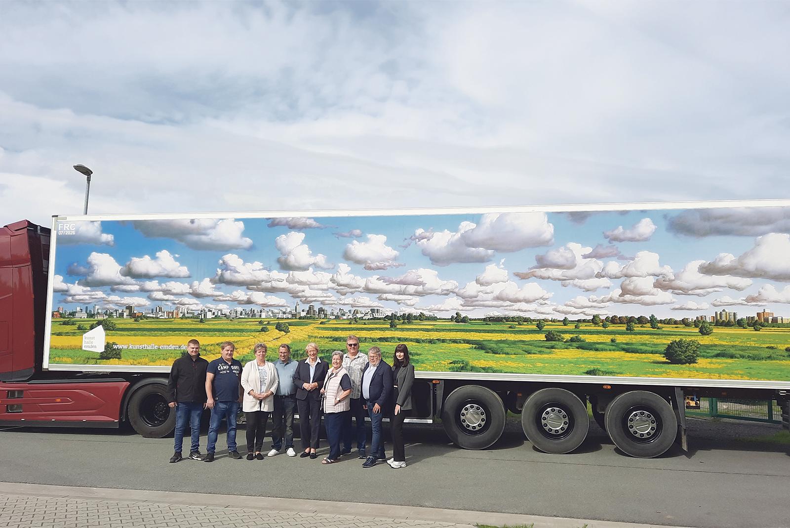 Auf Vermittlung des Emders Max Merkel wurde jetzt ein großer Kühltransporter der Firma Markus Köhler Logistik mit dem Gemälde »Norddeutschen Landschaft« von Heiner Altmeppen sowie der Außenaufnahme der ...