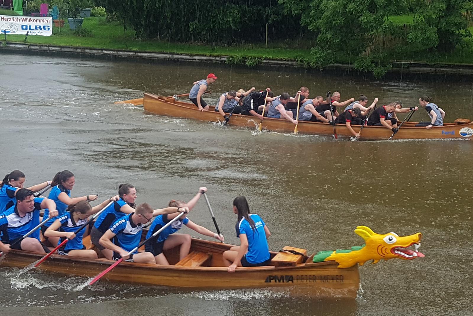 Spannende Duelle laufen gerade beim Drachenbootrennen in Weener. Es herrscht am Hafen gute Stimmung trotz Regen.