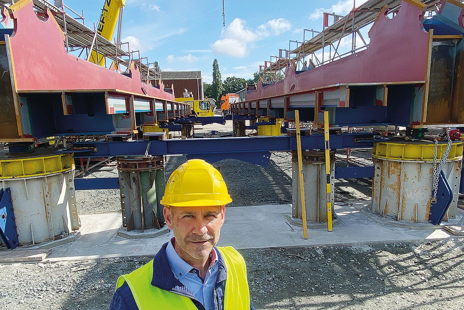 Der Anfang ist gemacht. EFG Port-Chef Holger Wedemann vor den ersten Stahlteilen der neuen Friesenbrücke.  © Foto: Hanken