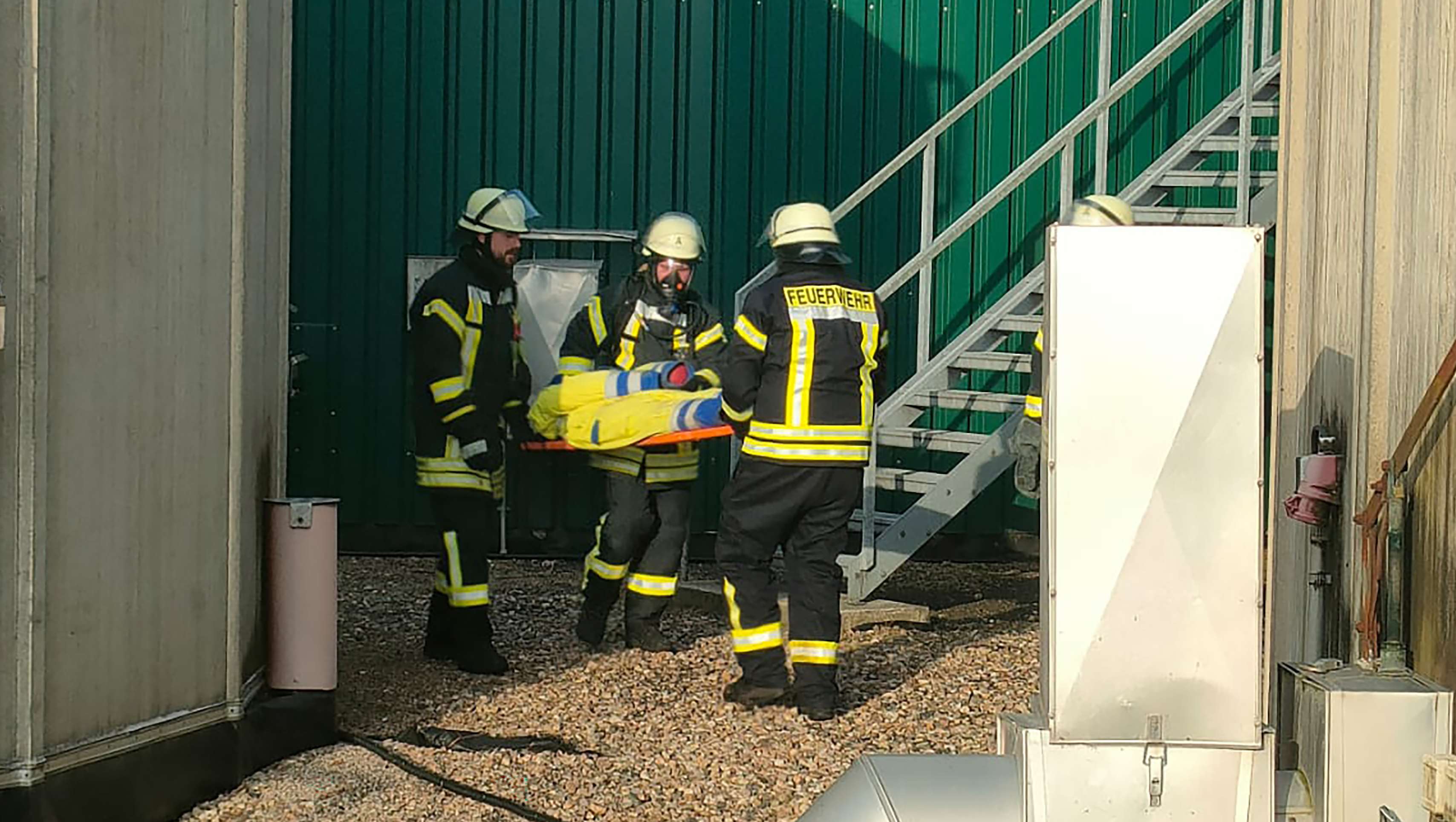 Nach kurzer Zeit hatten Einsatzkräfte unter Atemschutz den „Vermissten“, er wurde durch eine Übungspuppe dargestellt, gefunden und ins Freie gebracht. Außerdem war ein Arbeiter im oberen Bereich der Anlage zusammengebrochen und musste ebenfalls gerettet werden. Auch hier galt es, eine Übungspuppe zu bergen.