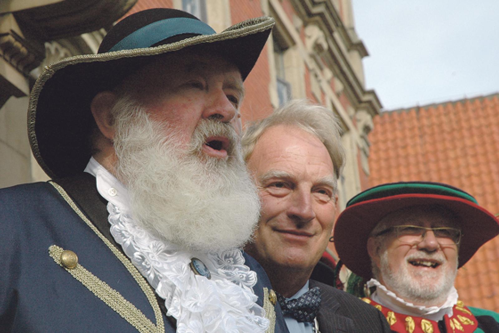 Stimmgewaltig meldete sich von der Rathaustreppe auch wieder Winschotens Stadtausrufer Geert Veen zu Wort. Der Leeraner Bürgermeister Wolfgang Kellner und Chef-Herold Hans-Arno Loerts (von links) waren beeindruckt. ©