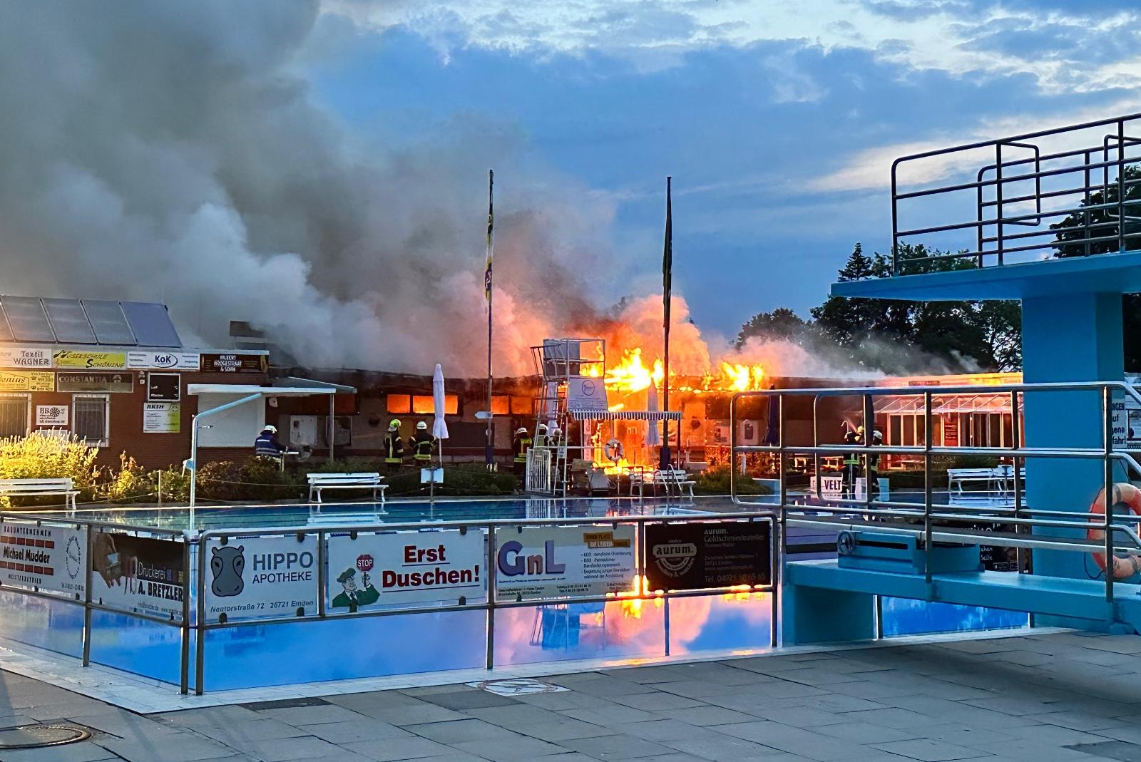Nach intensiven Ermittlungen ist es der Polizei in Emden und der Staatsanwaltschaft in Aurich gelungen, zwei Männer als Tatverdächtige zu der schweren Brandstiftung des Van-Ameren-Bades am 11. Juli in Emden festzunehmen. Im Rahmen der Ermittlungen erhärtete sich der Tatverdacht gegen zwei Heranwachsende und einen 25-Jährigen. Nach den bisherigen Erkenntnissen drangen die drei in der Tatnacht gemeinschaftlich in das Van-Ameren-Bad ein, entwendeten Bargeld und legten danach ein Feuer, welches einen verheerenden Schaden anrichtete.