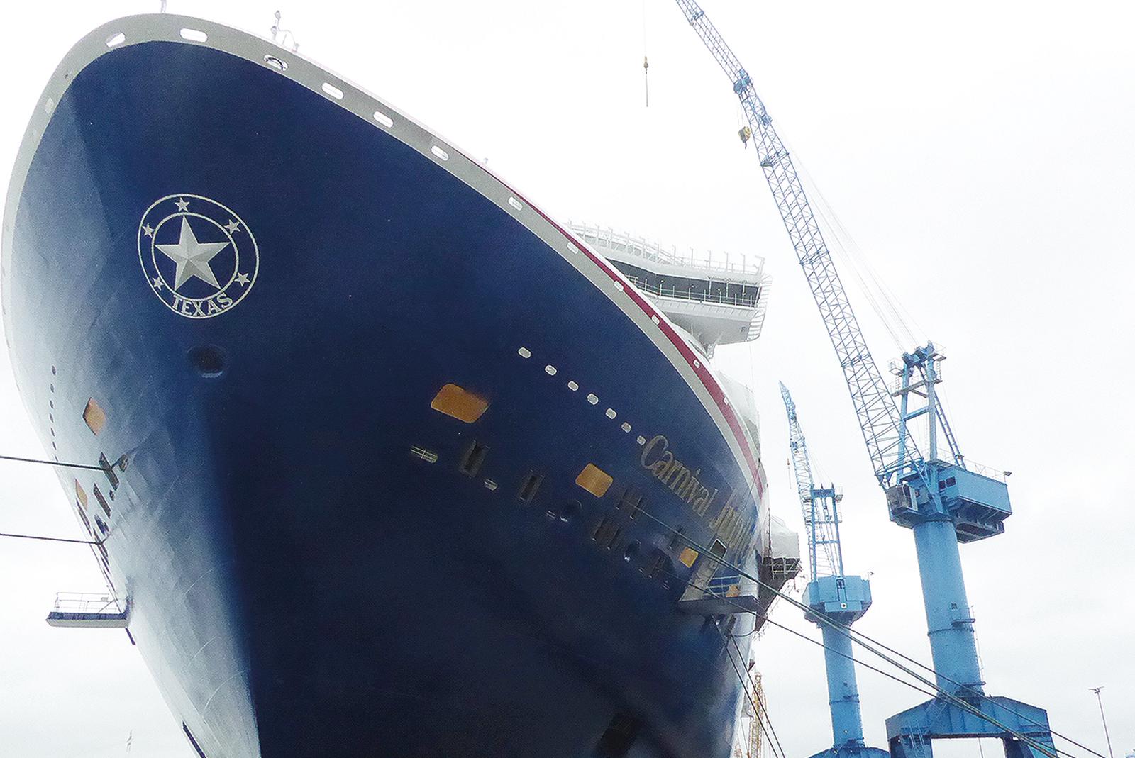 Die 345 Meter lange »Carnival Jubilee« liegt seit Juli am Ausrüstungskai im Werfthafen. Der Neubau bietet auf 20 Decks Platz für 5400 Passagiere. Das Schiff soll ab dem 23. Dezember zu ersten Karibik-Kreuzfahrt aufbrechen.