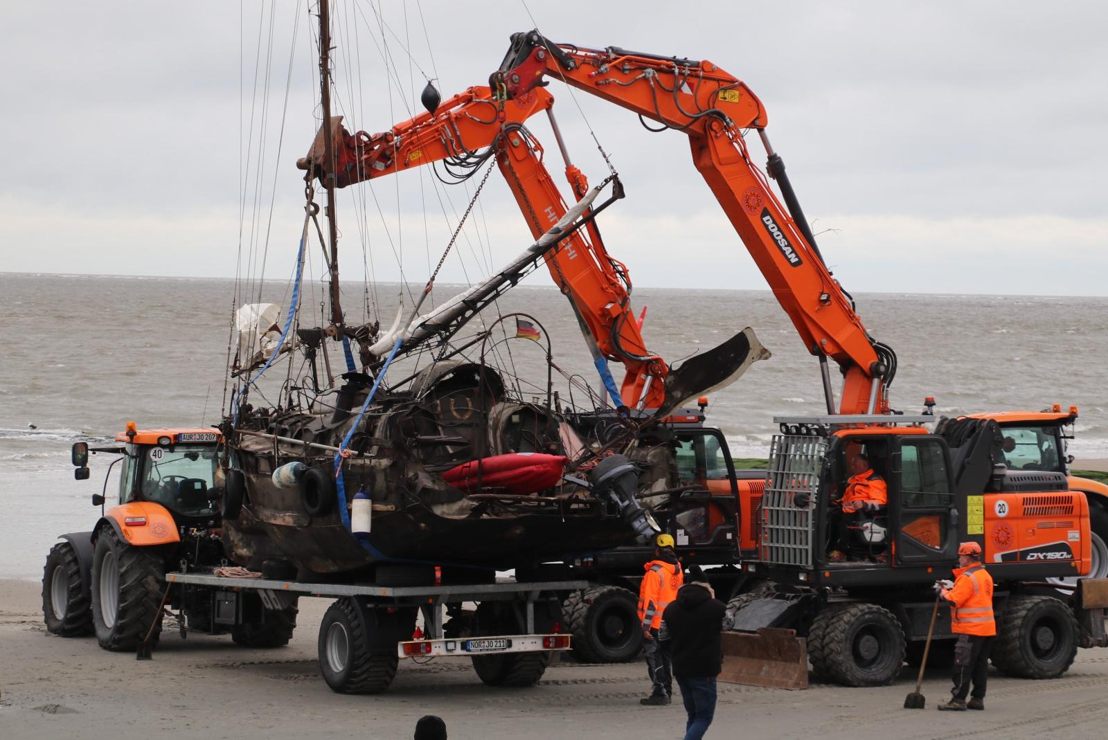 Das auf der Insel Norderney gestrandete und zur Touristenattraktion gewordene Segelboot ist geborgen. Mitarbeiter einer Fachfirma verluden die »Wibo« am Freitag bei Ebbe auf einen Anhänger und brachten sie in die Nähe des Inselhafens, ...