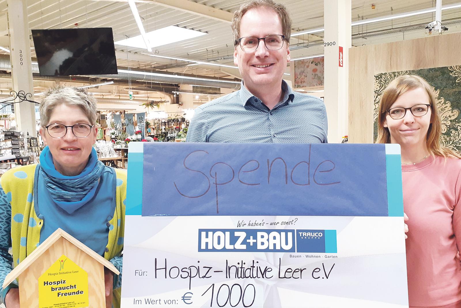 1000 Euro konnte Stephan Zimmermann, Geschäftsführer von »Holz+Bau Weener«, gestern an Marlies Smidt und Maike Janssen von der Leeraner Hospiz-Initiative übergeben. Das Geld stammt größtenteils aus dem Verkauf von Waffeln, Würstchen und Getränken wä...