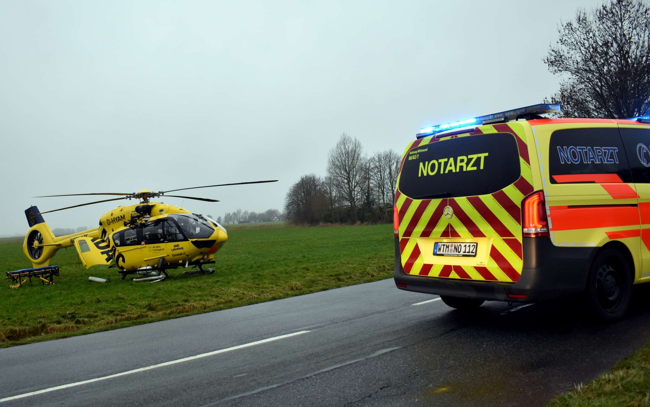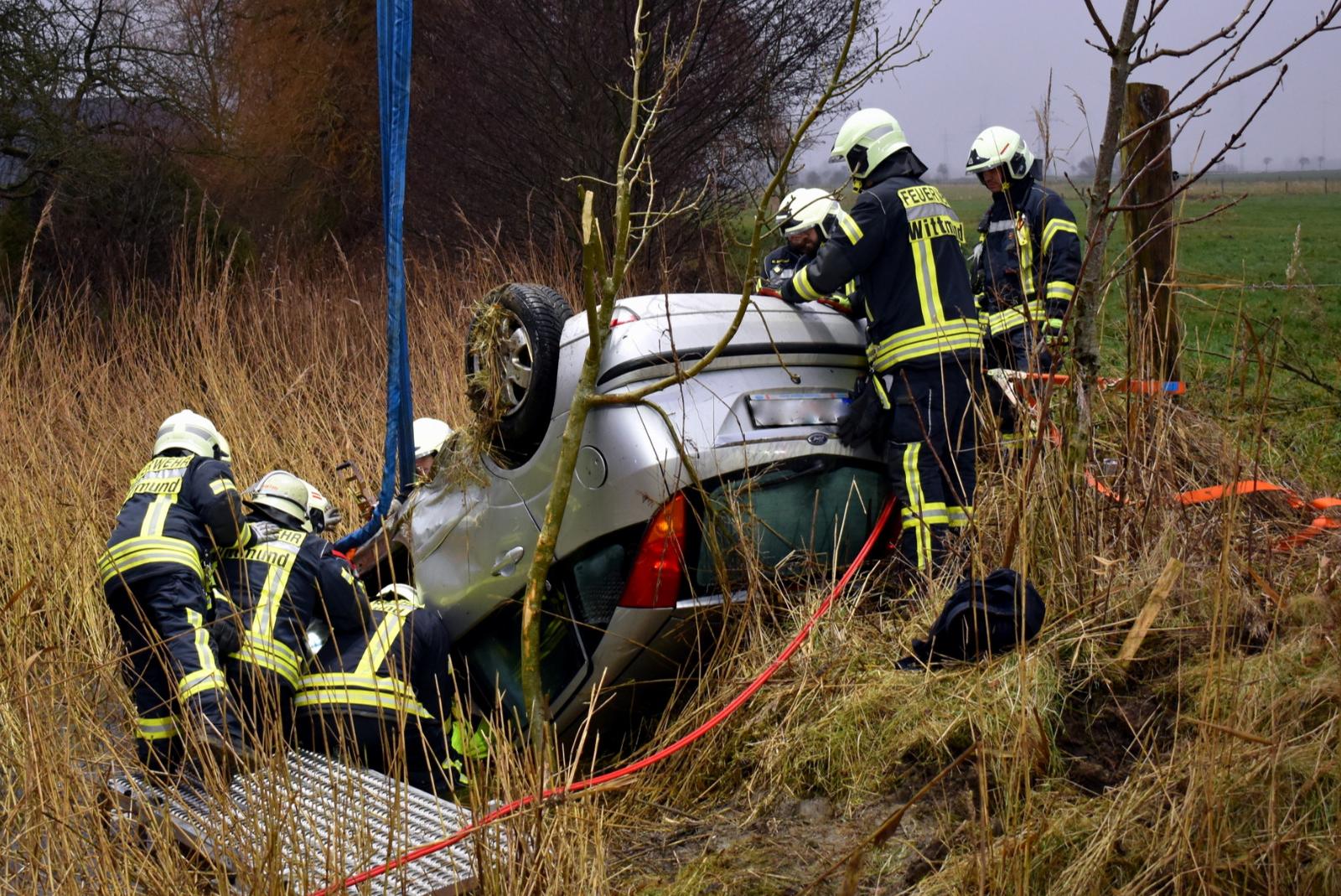 Ein 39-jähriger Autofahrer war von der Fahrbahn abgekommen, sein Wagen blieb in einem Wassergraben auf dem Fahrzeugdach liegen. Anhaltende Regenschauer und das Tauwetter der vergangenen Tage hatten dafür gesorgt, dass der Wassergraben zu drei Vierteln mit Wasser gefüllt war. Um ein Ertrinken des eingeklemmten Fahrers zu verhindern, haben die Einsatzkräfte das Wasser aus dem Graben abgepumpt sowie das Fahrzeug gegen weiteres Nachsacken gesichert. Die Feuerwehr befreite den Fahrer aus seinem Wagen. Zur weiteren Behandlung wurde der 39-jährige an die Besatzung des Rettungshubschraubers Christoph 26 übergeben und in ein Krankenhaus geflogen. Der Einsatz für die Feuerwehr konnte gegen 10 Uhr beendet werden.