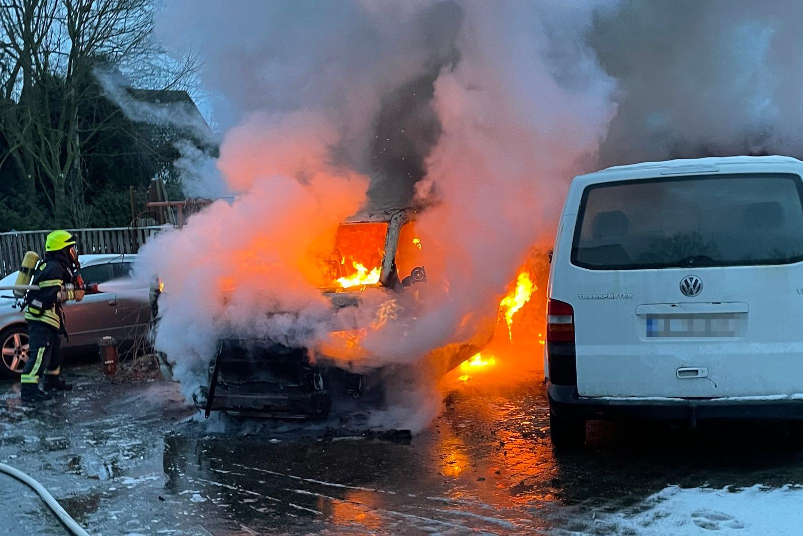 Das Fahrzeug wurde nach Polizeiangaben zunächst durch einen 36-Jährigen gestartet. Während der Mann das Fahrzeug für einen Moment unbeobachtet ließ, fing der VW Feuer. Umgehend alarmierte er die Rettungskräfte. Dennoch konnte nicht verhindert werden, dass der Transporter vollständig ausbrannte. Durch den Brand wurden ein weiterer VW Transporter und ein anliegender Zaun leicht beschädigt. Die Gesamtschadenshöhe ist bislang noch unklar.