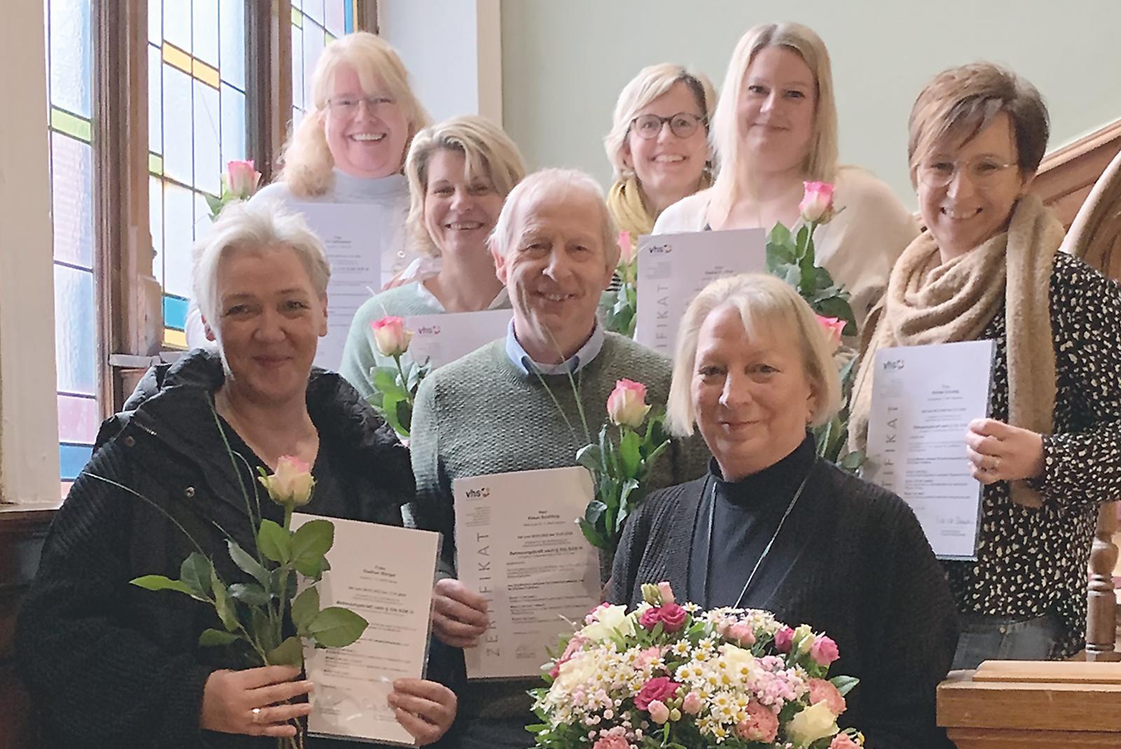 Im Rahmen einer beruflichen Fortbildung haben sich sechs Frauen und ein Mann jetzt bei der VHS Papenburg zur Betreuungskraft weitergebildet und können nun alte und dementiell erkrankte Menschen in Pflegeeinrichtungen betreuen. Mit Gudrun Börger, Saskia de ...