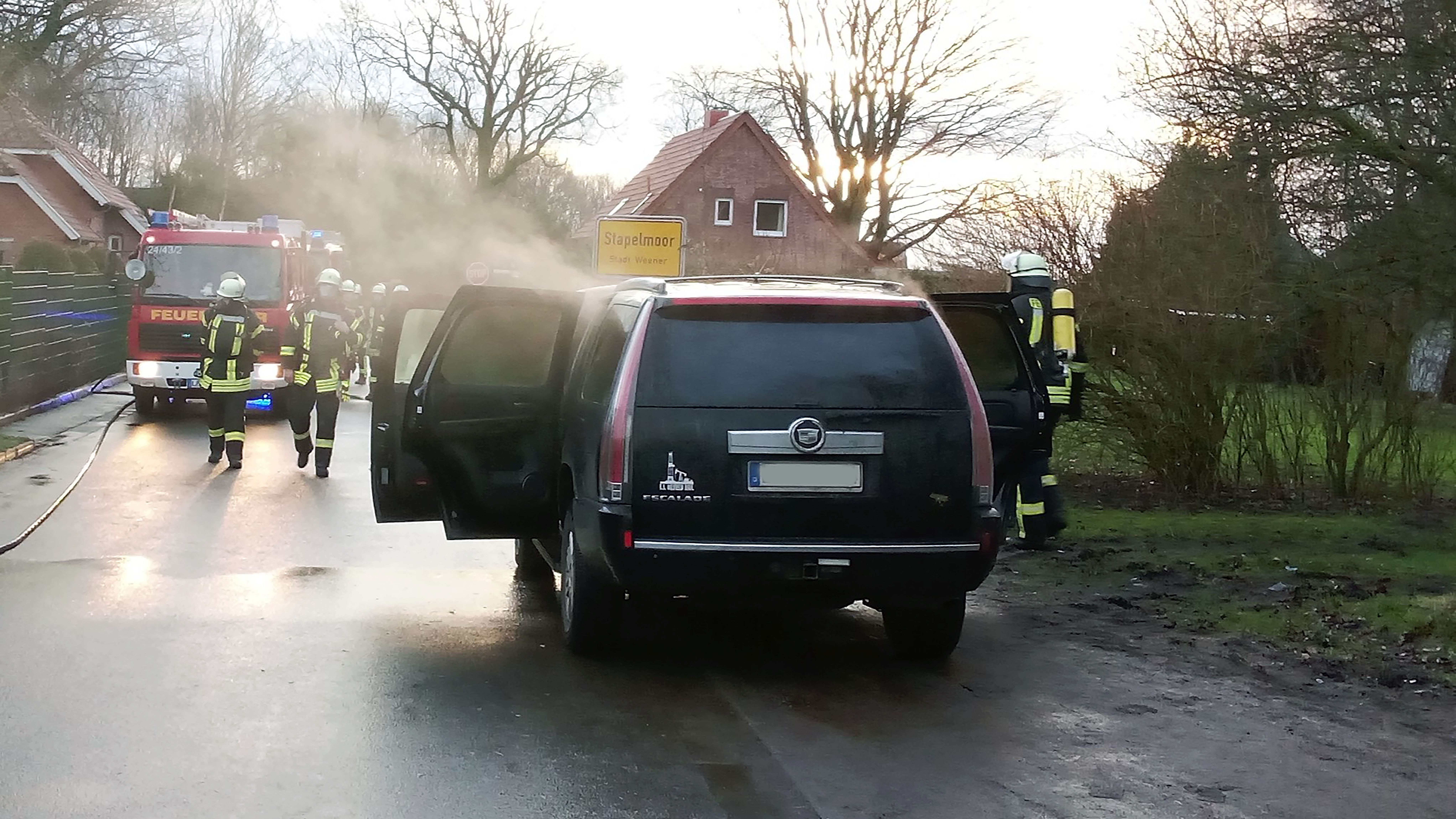 Die Feuerwehren Diele, Stapelmoor, Weener und Vellage waren heute um 7.50 Uhr an der Schulstraße in Stapelmoor im Einsatz, um einen Schwelbrand in einem Auto zu löschen. Während der Fahrt hatte es in einem Cadillac Escalade im Innenraum zu qualmen begonnen.