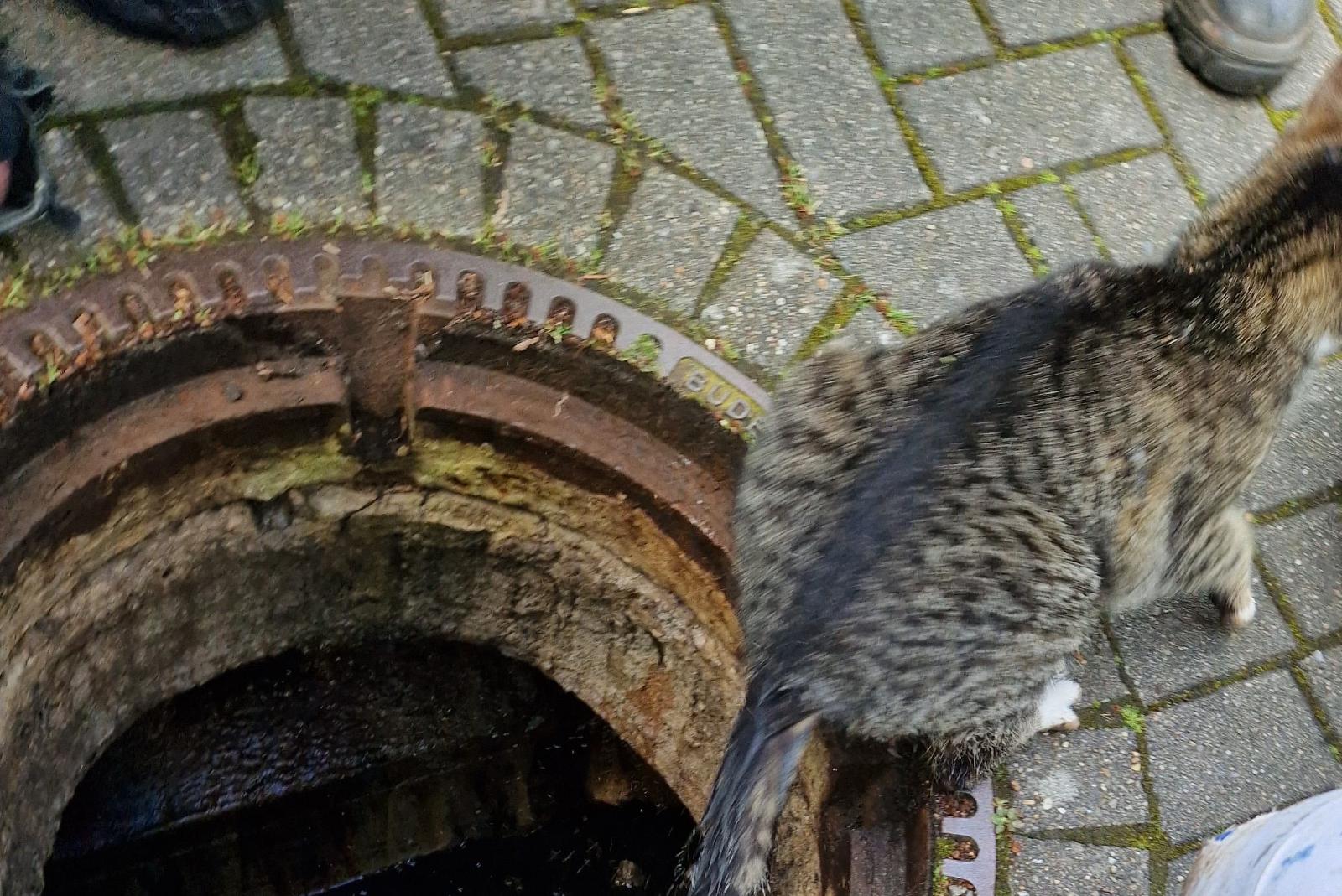 Die Schlauchleitung blieb in diesem Fall auf dem Fahrzeug verlastet. Stattdessen kam ein sogenanntes Halligantool, ein multifunktionales Brechwerkzeug, zum Einsatz. Mit dem Hilfsmittel versuchten die Kräfte der Feuerwehr einen Gully aufzuhebeln. Da der Deckel des Gullys nicht zu öffnen war, wurde der gesamte Gully ausgebaut, um an das Rohrsystem zu gelangen. Daraufhin wurde mit der Wärmebildkamera in das Rohr geschaut, um das Tier ausfindig zu machen. Der Versuch war vergeblich, so wurde das Jaulen weiter verfolgt. Ein Kanaldeckel sollte mehr Erfolg bringen. Der wurde geöffnet und plötzlich sprang eine Katze aus dem Schacht hervor. So konnte der Einsatz nach einer halben Stunde beendet werden.