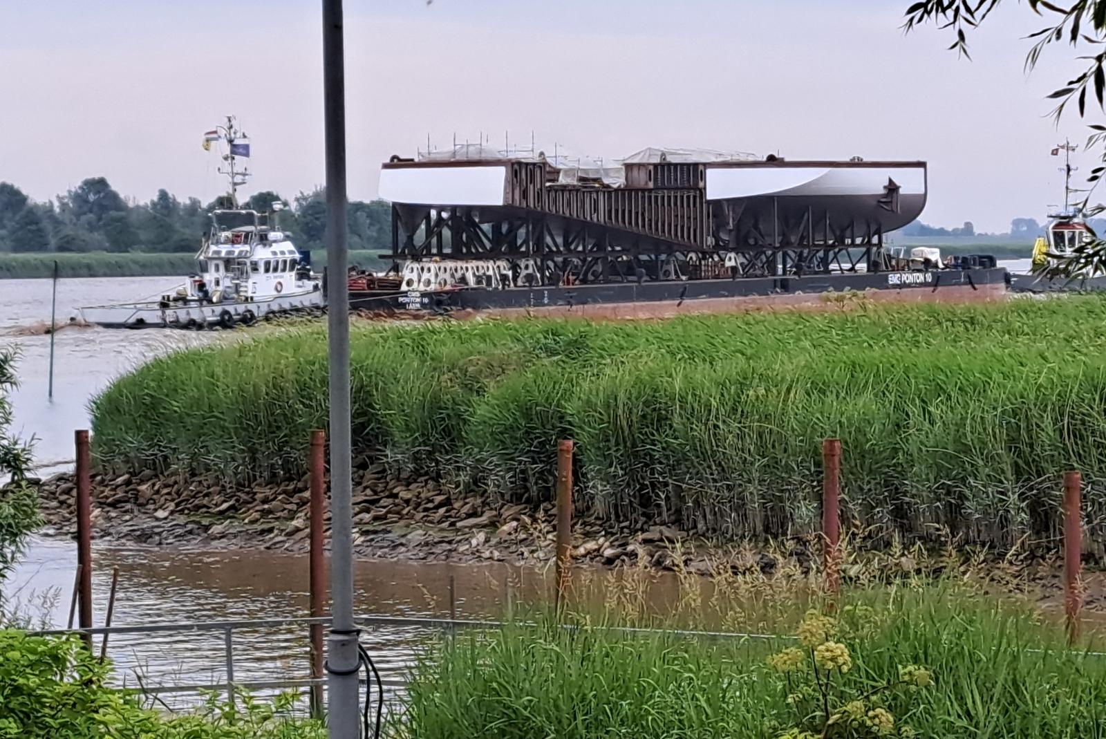 Mit Unterstützung von zwei Schleppern sind am Freitag auf einem Pontonschiff große Bauteile für einen neuen Ozeanriesen über die Ems zur Meyer Werft nach Papenburg transportiert worden. Dabei handelt es sich um Elemente ...