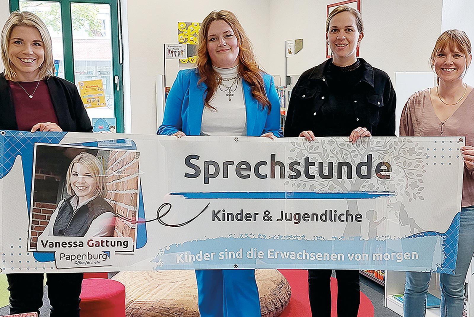 Eine Kinder- und Jugendsprechstunde fand vor Kurzem wieder in der Stadtbibliothek in Papenburg statt. Bürgermeisterin Vanessa Gattung (links) hatte die Jugendlichen dazu eingeladen. Zu Beginn wurde das neue Banner zur Sprechstunde präsentiert. Es ist das Ergebnis eines Projektes ...