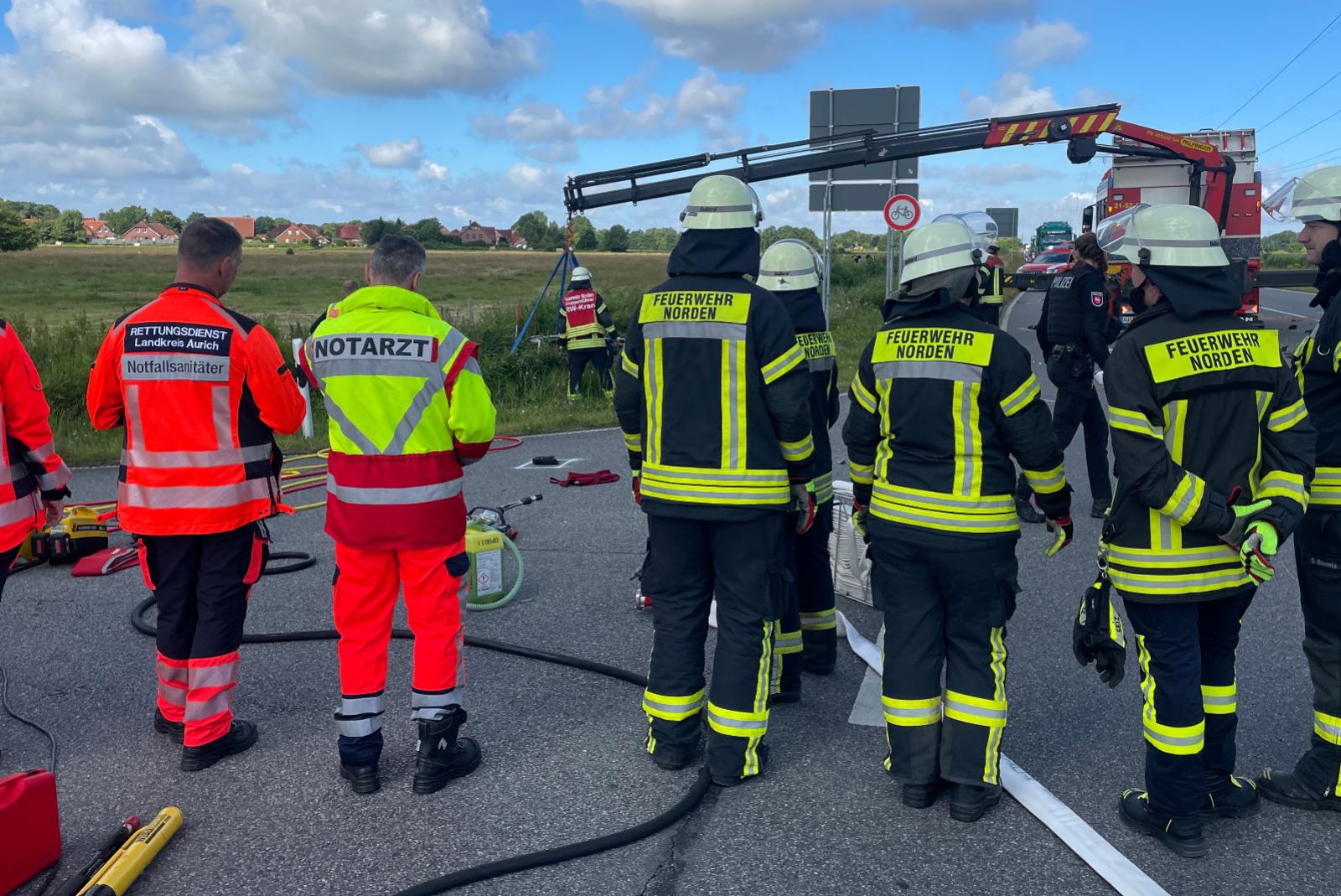 Die beiden Insassinnen des Suzuki, der im Graben lag, wurden in dem durch die Wucht der Kollision verformten Wagen eingeklemmt. Einsatzkräfte der Freiwilligen Feuerwehr Norden,so die Feuerwehr, begannen vor Ort umgehend mit der Befreiung der Eingeklemmten, unter Zuhilfenahme von hydraulischen Rettungsgeräten. Der Unfallwagen wurden von der Feuerwehr mit einem Kran geborgen. Der Lastwagen kam ebenfalls schwer beschädigt auf der Bundestraße zum Stehen.