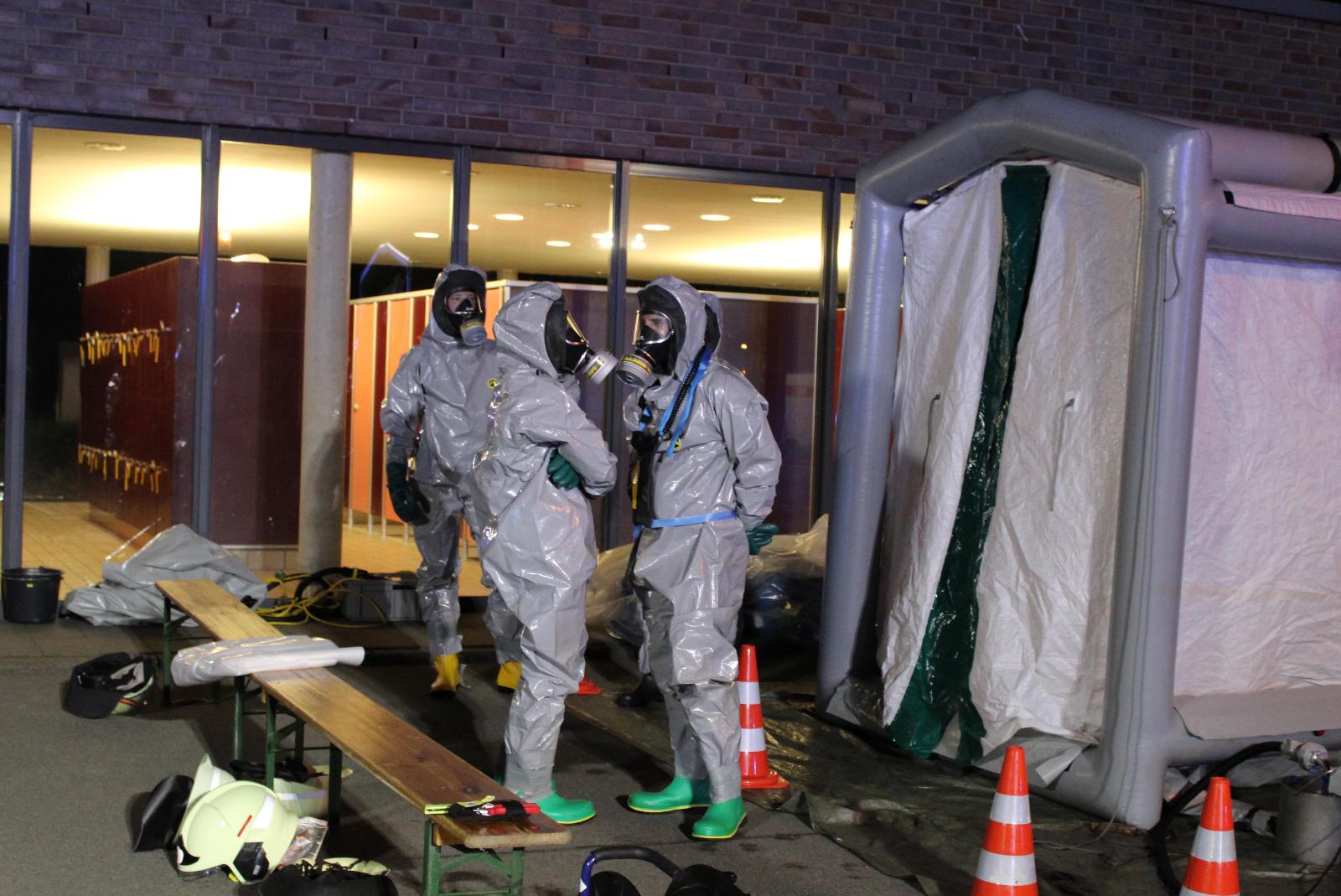 Eine erste Erkundung der Feuerwehr bestätigten den Chlorgasaustritt aus einem Nebengebäude des Schwimmbads rasch. Kurz darauf eintreffende Spezialkräfte des bei der Feuerwehr Sandhorst stationierten Gefahrgutzuges rüsteten sich mit Chemikalienschutzanzügen aus, um Messungen vornehmen und die Leckage ausfindig machen zu können. Unterstützt wurden diese Maßnahmen zusätzlich durch Kräfte des ABC-Zuges des Landkreises Aurich aus Osterhusen.