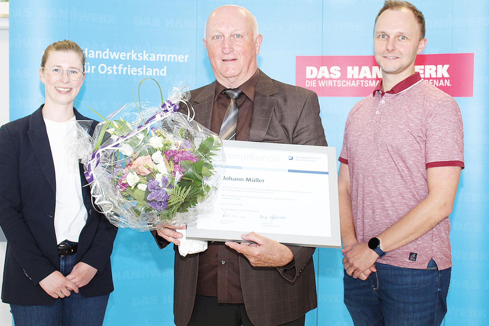 Das Berufsbildungszentrum (BBZ) der Handwerkskammer für Ostfriesland hat Diplom-Kaufmann Johann Müller aus Schirumer-Leegmoor für seine Tätigkeit als Dozent geehrt. Ramona Ripken (links), Leiterin des Bereiches Verwaltung im BBZ, und Weiterbildungskoordinator Uwe Redenius überreichten dem 76-Jährigen ...