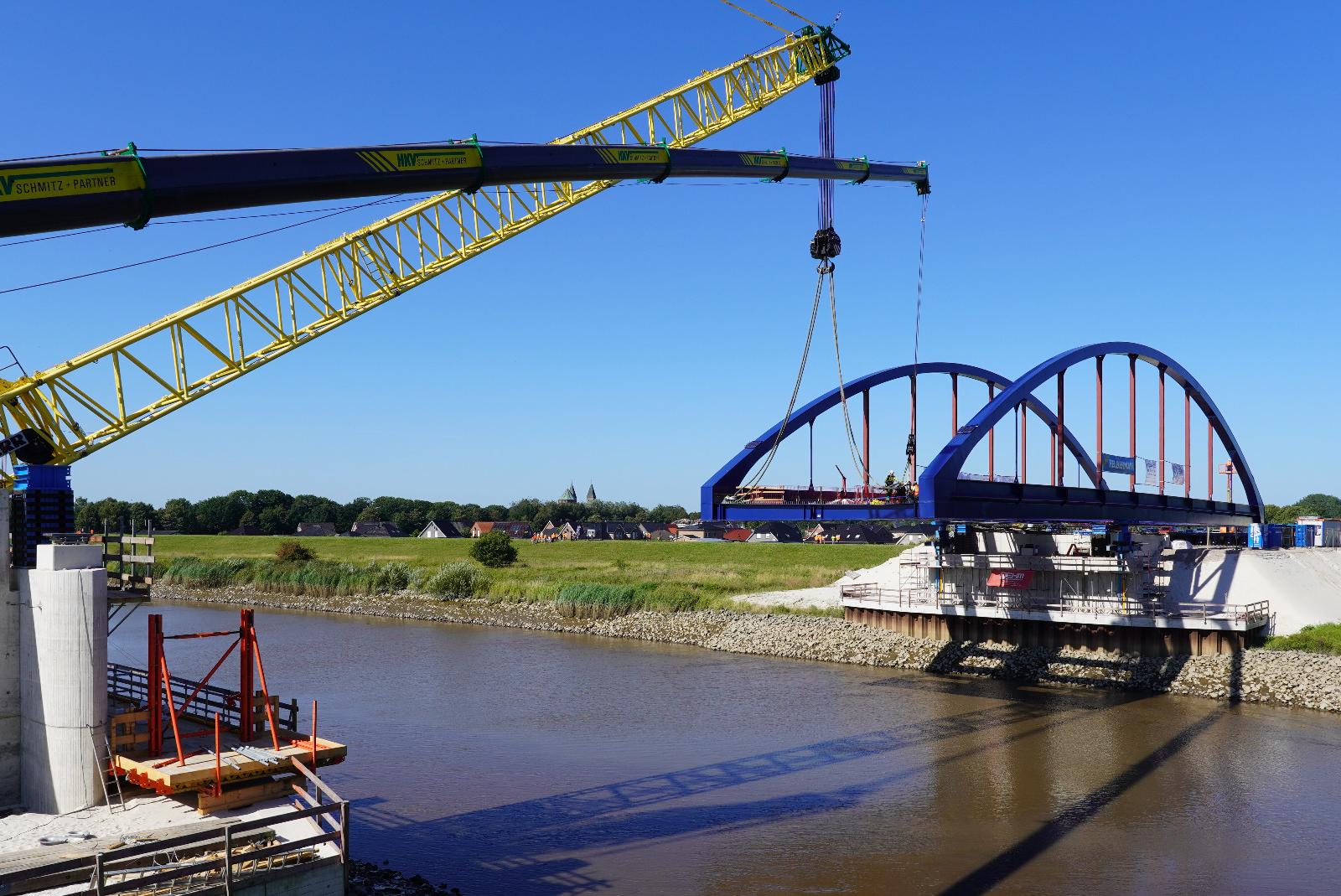 Zentimeter für Zentimeter wurde gestern in Rhede die neue Emsbrücke, deren Stahlkonstruktion rund 450 Tonnen wiegt, mithilfe von sogenannten Kletterpressen über die Ems geschoben. Nachdem die Arbeiten am Morgen gegen 8 Uhr begonnen hatten, ragte das insgesamt 82 ...