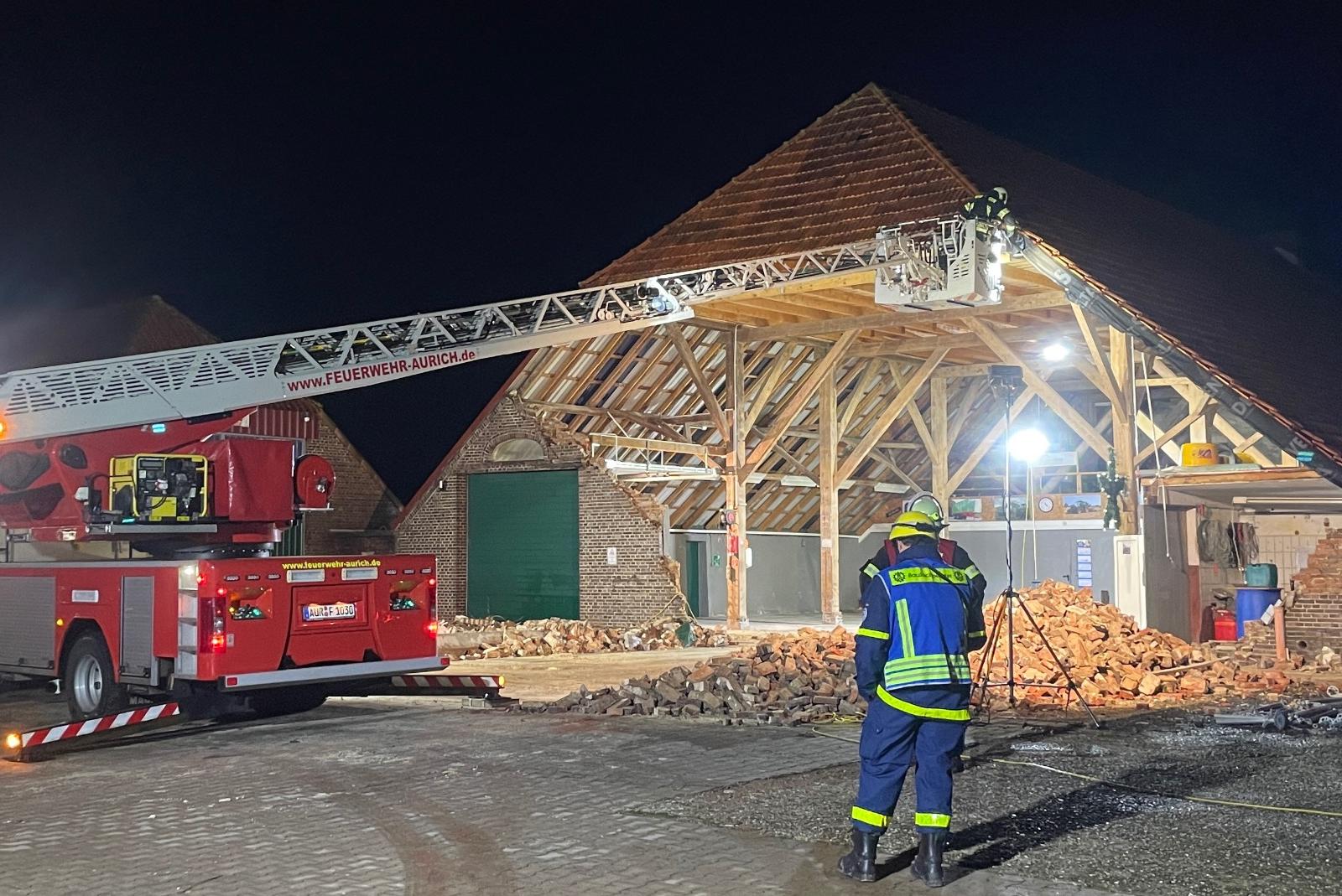 Erneut ist am Samstagabend ein starkes Gewitter über Aurich gezogen. Während sich die Regenfälle diesmal aber weitaus weniger drastisch als noch vor etwas mehr als einer Woche darstellen sollten, wehte der Wind laut der Feuerwehr mit teilweise stürmischen Böen und ließ damit unter anderem größere Äste von Bäumen abbrechen. Die größte Auswirkung der kräftigen Windböen zeigte sich in Aurich-Middels, wo die komplette Giebelwand eines landwirtschaftlichen Gebäudes in der Ogenbarger Kirchstraße einstürzte. Glücklicherweise wurde hierbei laut der Mitteilung niemand verletzt, jedoch drohten aufgrund des anhaltenden Windes auch noch weitere Teile des Scheunentraktes einzustürzen. Alarmierte Einsatzkräfte der Feuerwehr Middels entschieden sich umgehend dazu, den Baufachberater des Technischen Hilfswerks hinzuzuziehen, um Gewissheit über die Statik des Anwesens erhalten zu können. Dieser konnte nach einer ersten Begutachtung in Kombination mit einer Beruhigung der Wetterlage zunächst Entwarnung hinsichtlich eines möglichen weiteren Einsturzes geben. Deshalb wurden die vorhandenen Gebäudeteile bestmöglich gesichert.