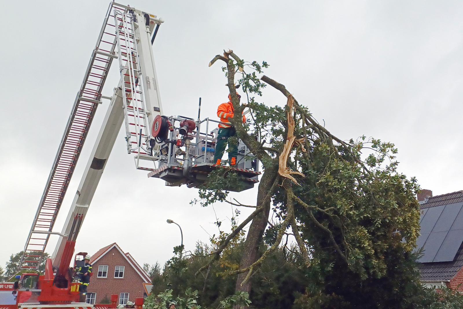 Zur Unterstützung wurde die Hubrettungsbühne der Feuerwehr Weener angefordert, wie Pressesprecher Joachim Rand mitteilte. So konnten zunächst einige Äste abgeschnitten werden, um die abgebrochene Baumkrone anschließend Stück für Stück abzusägen und somit die Gefahrenquellen beseitigt.