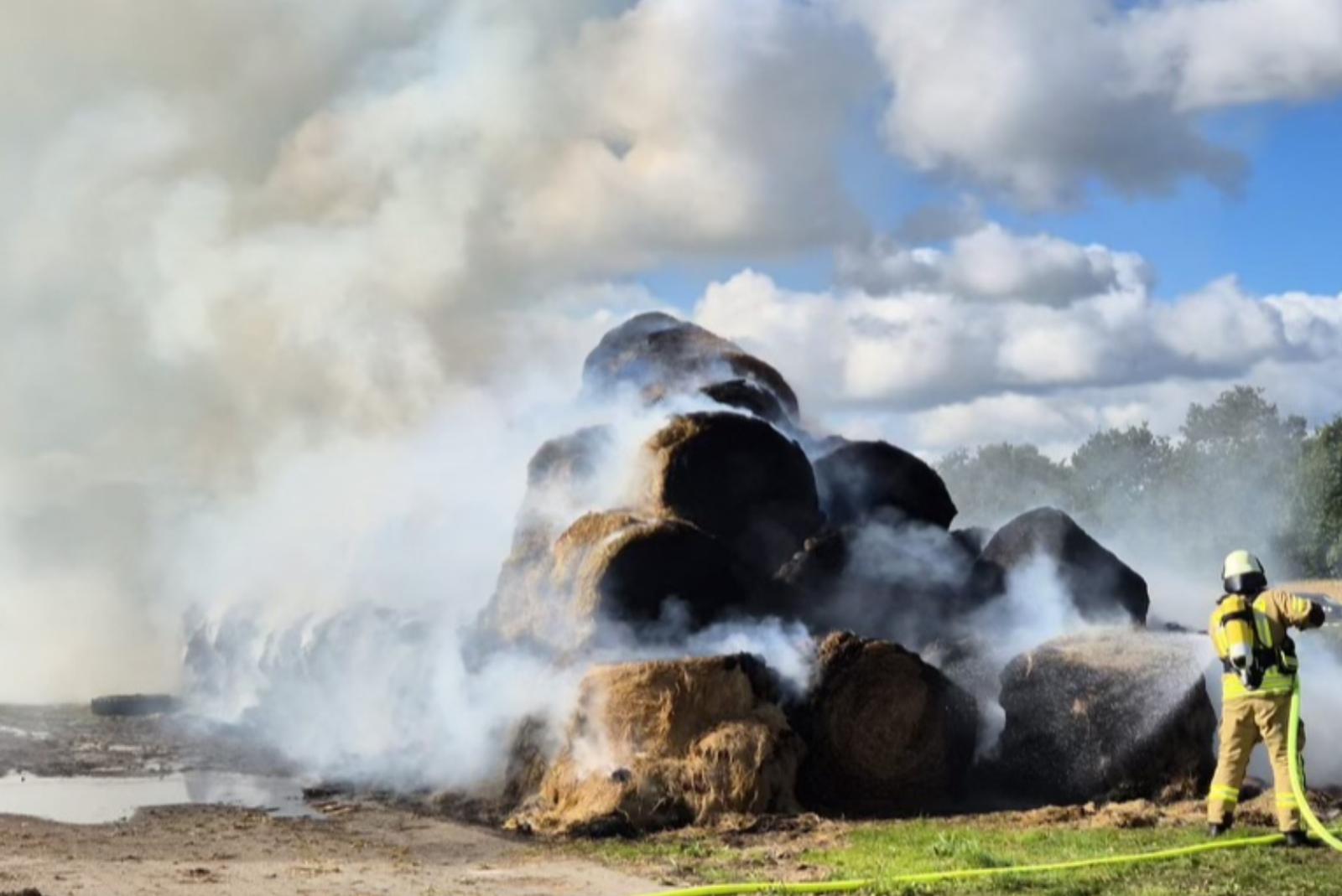„Die Löscharbeiten sind gerade abgeschlossen, es ist nur noch eine Feuerwehr vor Ort“, so Dominik Janßen heute am frühen Abend. „Es ist eine sehr langwierige Arbeit.“ Alle Ballen mussten mit schwerem Gerät auseinandergezogen und einzeln abgelöscht werden.