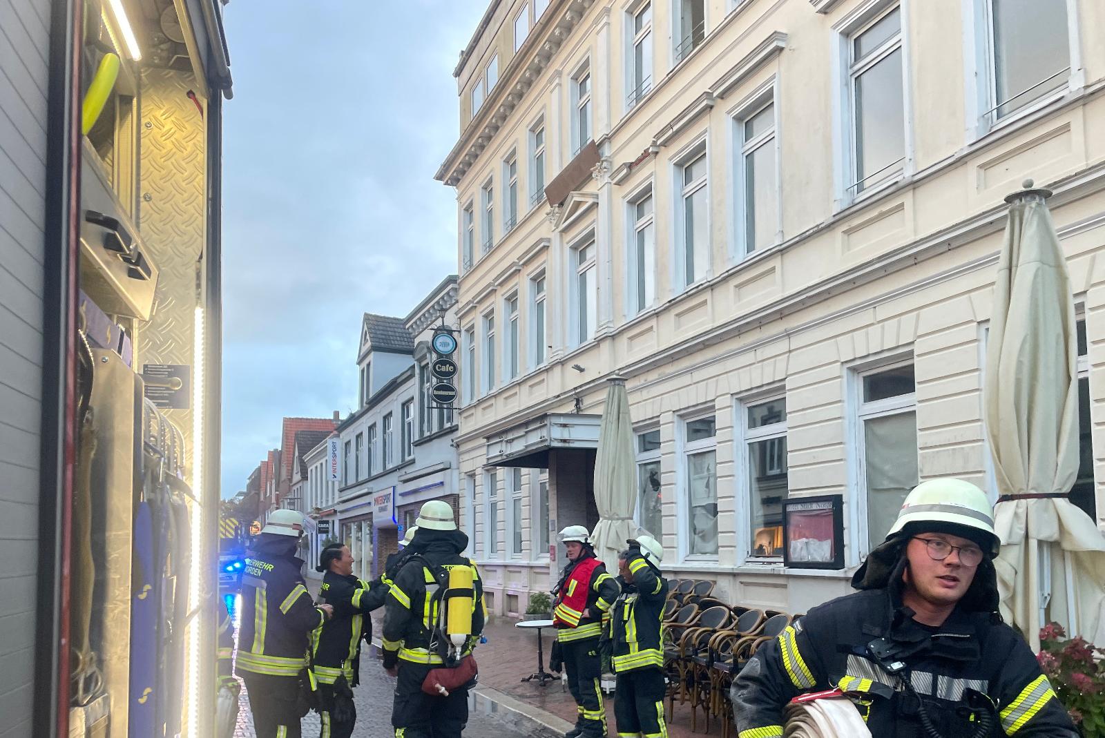 Passanten hatten um 17.40 Uhr Rauch aus dem dritten Obergeschoss aufsteigen sehen und die Feuerwehr gerufen. Die Einsatzkräfte der Freiwilligen Feuerwehr Norden rückten daraufhin mit einem größeren Aufgebot in die enge Norder Innenstadt aus.