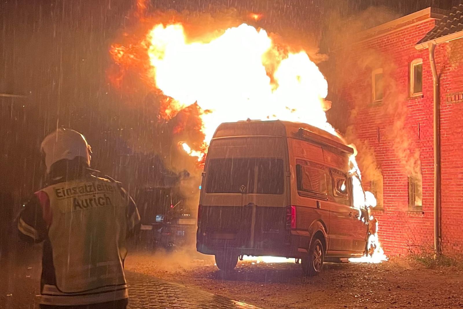Die Feuerwehr Aurich war nach eigenen Angaben um 0.22 Uhr zunächst aufgrund eines brennenden Wohnmobils alarmiert worden. Als die ersten Kräfte am Einsatzort eintrafen, hatten die Flammen des in Vollbrand stehenden Campers bereits auf einen nebenstehenden Pkw übergegriffen und bedrohten die angrenzende Gebäudefassade massivst. Umgehend wurde ein umfangreicher Löschangriff mit zwei Atemschutztrupps eingeleitet sowie die Alarmstufe erhöht, um weitere Einsatzkräfte hinzuzuziehen.